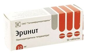 Показания к применениюИБС, стенокардия (профилактика приступов, в т.ч. в постинфарктном периоде); сердечная недостаточность (в составе комплексной терапии).Применение при беременности и кормлении грудьюПри беременности и в период лактации применять с осторожностью.ПротивопоказанияГиперчувствительность, тяжелая артериальная гипотензия (систолическое артериальное давление ниже 90 мм рт. ст., диастолическое артериальное давление ниже 60 мм рт.ст.), коллапс, шок, острый инфаркт миокарда, протекающий с гипотонией, геморрагический инсульт, черепно-мозговая травма, закрытоугольная глаукома, тяжелая печеночная недостаточность (риск развития метгемоглобинемии), тяжелая почечная недостаточность, тяжелая анемия, гипертрофическая обструктивная кардиомиопатия, констриктивный перикардит, тампонада сердца, тяжелый стеноз аортального и /или митрального клапана, гипертиреоз, первичная легочная гипертензия (гиперемия недостаточно вентилируемых альвеолярных зон может привести к гипоксии), хроническая сердечная недостаточность с низким давлением наполнения левого желудочка, одновременный прием ингибиторов фосфодиэстеразы-5 (в т.ч. силденафил, варденафил, тадалафил), непереносимость лактозы и сахарозы, дефицит сахаразы-изомальтазы, лактазы или глюкозо-галактозы мальабсорбция, повышенная чувствительность к препарату и его компонентам, другим органическим нитратам, возраст до 18 лет (эффективность и безопасность не установлены).; С осторожностью;Применяют при склонности к артериальной гипотензии у лиц пожилого возраста, обезвоженным пациентам; при склонности к ортостатической гипотензии в анамнезе.Побочное действиеСо стороны пищеварительной системы: диспептические симптомы.; Со стороны ЦНС: чувство усталости, беспокойство; редко — головная боль, головокружение.; Со стороны сердечно-сосудистой системы: редко — ортостатическая гипотензия.; Прочие: повышенная потливость, кожные аллергические реакции.СоставПентаэритритила тетранитрат 10 мгВзаимодействие с другими препаратамиПри одновременном приеме данного препарата с другими лекарственными средствами посоветуйтесь с лечащим врачом.; Под влиянием дигидроэрготамина возможно снижение антиангинального эффекта эринита. Сочетание этих средств считают нерациональным.; Возможно усиление гипотензивного действия при одновременном применении с вазодилататорами и гипотензивными средствами (бета-адреноблокаторами, блокаторами кальциевых каналов и др.), нейролептиками, трициклическими антидепрессантами, ингибиторами моноаминоксидазы, прокаинамидом, этанолом, ингибиторами фосфодиэстеразы-5.; Комбинация с анаприлином является рациональной, так как антиангинальное действие усиливается.