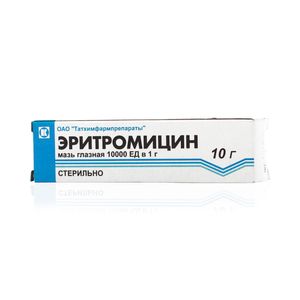 Показания к применению конъюнктивит (в т.ч. у новорожденных), офтальмия новорожденных, бактериальные блефарит, блефароконъюнктивит, кератит, мейбомит (ячмень), хламидиоз, трахома.Противопоказания тяжелые нарушения печеночной функции; повышенная чувствительность к компонентам препарата.Побочное действиеПри применении мази возможно раздражающее действие (покраснение, зуд).При длительном применении может развиться вторичная инфекция, вызванная устойчивыми к эритромицину микроорганизмами.Состав1 г мази глазной содержит:Действующее вещество:эритромицина (в пересчете на активное вещество) — 10000 ЕДВспомогательные компоненты:ланолин безводный — 0,4 г,дисульфит натрия — 0,0001г,вазелин специальный — до 1 г.Взаимодействие с другими препаратамиЭритромицин — это антагонист линкомицина, клиндамицина, хлорамфеникола. Он способен значительно снижать бактерицидное действие бета-лактамных антибактериальных средств (пенициллинов, цефалоспоринов, карбопенемов).Одновременное использование лекарственных наружных форм эритромицина и абразивных веществ, вызывающих раздражение кожи, либо со средствами, вызывающими отшелушивание кожи, возможно проявление кумулятивного раздражающего или высушивающего эффекта.
