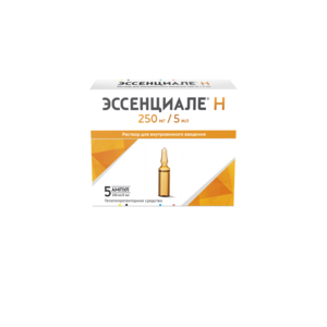 Показания к применениюЖировая дегенерация печени (в т.ч. при сахарном диабете);- острый гепатит;- хронический гепатит;- цирроз печени;- некроз клеток печени;- печеночная кома и прекома;- токсические поражения печени;- токсикоз беременности;- пред- и послеоперационное лечение, особенно, при операциях в области гепатобилиарной зоны;- псориаз;- радиационный синдром.Применение при беременности и кормлении грудьюС осторожностью следует применять Эссенциале Н при беременности в связи с наличием в составе препарата бензилового спирта, который может проникать через плацентарный барьер (применение препаратов, содержащих бензиловый спирт, у рожденных в срок новорожденных или недоношенных новорожденных ассоциировалось у них с развитием синдрома одышки с летальным исходом).ПротивопоказанияПовышенная чувствительность к компонентам препарата; детский возраст до 3 лет.Побочное действиеСо стороны иммунной системы: редко — из-за содержания в составе препарата бензилового спирта возможно развитие реакций повышенной чувствительности; очень редко — кожные аллергические реакции (сыпь, экзантема или крапивница); частота неизвестна — зуд.СоставДействующее вещество: Фосфолипиды (Phospholipides)Концентрация действующего вещества (мг): 250Взаимодействие с другими препаратамиДо настоящего времени не известны.