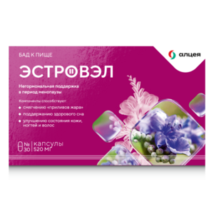 Эстровэл – комплекс фитоэстрогенов, витаминов и микроэлементов* с богатым составом, который был создан специально для женщин.Изофлавоны сои — фитоэстрогены в составе БАД «Эстровэл» — способствуют смягчению различных проявлений климакса, обусловленных гормональной перестройкой женского организма. * Витамины, микроэлементы и минералы, содержащиеся в негормональном комплексе «Эстровэл», усиливают действие фитоэстрогенов* и могут помочь поддержать женщину как на физическом, так и на эмоциональном уровне. Индол-З-Карбинол — способствует нормализации гормонального баланса и снижению риска развития опухолей, подавлению вируса Herpes simplex и вируса папилломы человека.Экстракт плодов Витекса священного – способствует снижению уровня раздражительности, нервозности, болезненности молочных желез, вздутия живота, головных болей.Витамин K1 — играет важную роль в формировании и восстановлении костей. Витамин Е — является эталоном антиоксидантов. Помогает устранить симптомы вагинальной сухости, улучшает состояние кожи, ногтей, волос.Витамин В6 — ускоряет метаболизм белков, углеводов, жиров, повышает устойчивость к стрессам, оказывает благоприятное действие на сердечно-сосудистую и костную системы. Бор — способствует усилению действия фитоэстрогенов, способствует устранению приливов, вагинальной сухости и других климактерических проявлений. Необходим для поддержания здорового состояния костей.Фолиевая кислота (Витамин В9) — Обладает эстрогеноподобным действием, замедляя наступление климакса и ослабляя его симптомы.L-5-гидрокситриптофан — Совместно с витамином В6 увеличивает синтез эндорфинов, отвечающих за снижение восприятия боли, оказывает положительное влияние на функции организма. Если вы планируете ввести в свой рацион биологически активные добавки, прежде вам следует получить квалифицированное заключение специалиста. Только в этом случае прием добавок будет иметь максимальный благотворный эффект и позволит избежать неприятных последствий из-за несовместимости с другими средствами либо индивидуальной непереносимости.БАД. НЕ ЯВЛЯЕТСЯ ЛЕКАРСТВЕННЫМ СРЕДСТВОМ.*Инструкция по применению БАД к пище Эстровэл® СГР № RU.77.99.11.003.R.001242.05.24 от 21.05.2024 г. Обновленная формула БАД к пище «,ЭСТРОВЭЛ», способствует снижению симптомов предменструального и климактерического синдрома, нормализации уровня половых гормонов, оказывает мягкое послабляющее действие, способствует коррекции функциональ — ного состояния вегетативной нервной системы.Входящие в состав растительные экстракты проявляют эффекты, аналогичные действию собственных эстрогенов женского организма, т. е. лишены тех побочных действий, которые оказывают синтетические эстрогены.Свойства компонентов БАД к пище «,ЭСТРОВЭЛ»,: Изофлавоны соиИзофлавоны сои называют фитоэстрогенами. Это вещества растительного происхождения, по биологическому действию близкие к эстрогену, обладающие эстрогеноподобным действием при недостатке собственных гормонов и компенсирующие негативные эффекты эстрогена при его избытке. Применение изофлавонов способствует снижению частоты приливов, потливости, головных болей и других симптомов, наблюдающихся в климактерическом периоде.Также изофлавоны помогают регулировать гормональный дисбаланс при предменструальном синдроме (
