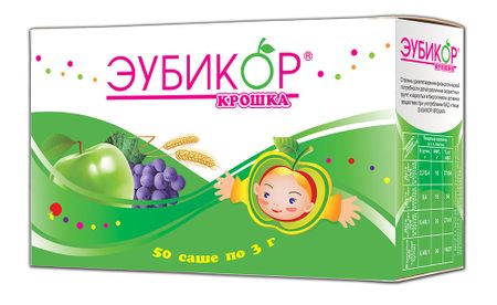ЭУБИКОР КРОШКА представляет собой инновационную формулу классического БАД ЭУБИКОР. БАД ЭУБИКОР − одно из первых, изобретенных в России, средств из группы пребиотиков. Технология производства ЭУБИКОР обеспечивает максимально полное сохранение всех биологически активных веществ, содержащихся в пшеничных отрубях и образующихся в процессе ферментации дрожжевой культуры. За счет включения в состав яблока сублимационной сушки и увеличения содержания пектиновых веществ обладает более привлекательными органолептическими свойствами и более мягким и щадящим воздействием на организм человека. При производстве ЭУБИКОР КРОШКА используются только натуральные ингредиенты, проходящие постоянную проверку качества. Технология производства обеспечивает максимально полное сохранение всех биологически активных веществ, содержащихся в ферментированных пшеничных отрубях и яблоке. ЭУБИКОР КРОШКА рекомендуется в качестве дополнительного источника нерастворимых и растворимых пищевых волокон. Может использоваться в составе комплексной диетической терапии, а также в рамках комплексных мероприятий по снижению риска многих заболеваний. ЭУБИКОР КРОШКА исходно разрабатывался на основании патента RU 2233320 C2: «Способ получения биологически активного препарата, биологически активная добавка (БАД) к пище пребиотического действия, приводящая к коррекции (нивелированию) метаболического синдрома и лекарственный препарат для регуляции микробиоценоза желудочно-кишечного тракта», приоритет изобретения 2001 г. ЭУБИКОР КРОШКА в качестве дополнительного источника нерастворимых и растворимых пищевых волокон, способствует восстановлению и поддержанию нормальной микрофлоры кишечника. Применение ЭУБИКОР КРОШКА способствует улучшению функционального состояния желудочно-кишечного тракта, оптимизации секреторной и моторно-эвакуаторной функций органов пищеварения, а также нормализации углеводного и липидного видов обмена веществ. Нормализация микрофлоры кишечника − одно из основных свойств ЭУБИКОР КРОШКА, позволяющее увеличить содержание анаэробов — бифидобактерий, лактобактерий, полноценной кишечной палочки и др., с сопутствующим уменьшением содержания аэробов — лактозоотрицательных кишечных палочек, условно-патогенных энтеробактерий, стафилококков, грибов рода Candida, вплоть до их элиминации. Кроме того, входящие в состав ЭУБИКОР КРОШКА пшеничные отруби обладают сорбционными свойствами. Компенсация дефицита пищевых волокон и восстановление кишечной микрофлоры при приеме БАД ЭУБИКОР КРОШКА способствуют:• Улучшению функционального состояния желудочно-кишечного тракта, оптимизации секреторной и моторно-эвакуаторной функций органов пищеварения; • Нормализации процессов переваривания и всасывания основных компонентов пищи; • Нормализации липидного обмена и снижению риска атеросклеротического поражения сосудов;• Нормализации углеводного обмена и снижению риска развития ожирения/сахарного диабета 2 типа;• Укреплению иммунитета и повышению сопротивляемости организма к инфекциям;• Снижению опасности образования камней в желчном пузыре и почках.Достоинства ЭУБИКОР КРОШКА: • Подходит для людей всех возрастов, начиная с 3 лет;• Не противопоказан беременным женщинам; • Может приниматься, как во время, так и после антиб