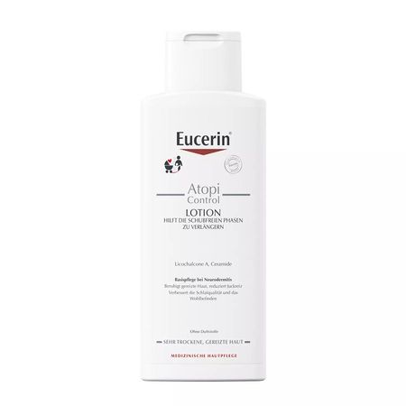 Кожа, пораженная атопическим дерматитом, сухая, раздраженная и подвержена зуду. Тяжесть течения заболевания усугубляется, что может оказывать отрицательное влияние на качество жизни и препятствовать нормальному сну. Лосьон для тела Eucerin Atopi Control подходит для ежедневного применения, он специально разработан для интенсивного увлажнения раздраженной и зудящей кожи. Легко впитывающийся лосьон обогащен успокаивающим ликохалконом А, церамидами и омега-кислотами, которые укрепляют кожный барьер, уменьшают сухость и зуд и продлевают период между обострениями атопического дерматита. При регулярном применении состояние кожи заметно улучшается, а кожа становится мягкой и гладкой. Лосьон Eucerin Atopi Control, не содержащий отдушек, также можно использовать вместе с успокаивающим кремом Eucerin Atopi Control во время обострения; было доказано, что он способствует здоровому сну и улучшает качество жизни у людей с атопическим дерматитом(1). Подходит для взрослых, детей и младенцев старше пяти месяцев. (1) Beiersdorf, исследование заявленных свойств Atopi Control, май 2017 г. Клинические исследования Исследования показали высокую эффективность и хорошую переносимость продукта на коже, подверженной атопическому дерматиту.