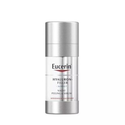 Инновационная ночная двойная сыворотка Эуцерин Hyaluron-Filler сочетает две мощные формулы для омоложения кожи: кремовую фазу с AHA-кислотами и сапонином, а также прозрачную фазу с гиалуроновой кислотой. Комплексное действие препарата стимулирует обновление, омоложение кожи, разглаживает даже глубокие морщины, очищает поры, делает кожу гладкой и сияющей. Eucerin Hyaluron-Filler Night Peeling & Serum прошла дерматологические и клинические испытания. Одно из таких исследований предусматривало изучение продукта в процессе использования. В нем принимало участие 150 женщин возрастом 35-55 лет. После четырех недель применения: 96% добровольцев отметили, что средство улучшает текстуру кожи, 95% – придает коже сияние, 93% – разглаживает и делает кожу сияющей, 91% – оказывает лифтинг-эффект, улучшает внешний вид кожи, придает ей упругость и уменьшает поры. Активные компоненты: высокомолекулярная гиалуроновая кислота увлажняет поверхность эпидермиса, разглаживает небольшие морщины и линии; низкомолекулярная гиалуроновая кислота помогает удерживать влагу в глубоких слоях кожи, борется с глубокими морщинами; AHA-комплекс (гликолевая, молочная, полигидроксикислота) мягко отшелушивают отмершие клетки и стимулируют обновление кожи, сохраняют ее эластичность, предупреждают уменьшение выработки коллагена; сапонин стимулирует синтез гиалуроновой кислоты в коже. некомедогенно