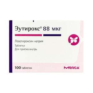 Показания к применению гипотиреоз, эутиреоидный зоб, в качестве заместительной терапии и для профилактики рецидива зоба после резекции щитовидной железы, рак щитовидной железы (после оперативного лечения), диффузный токсический зоб после достижения эутиреоидного состояния тиреостатиками (в качестве комбинированной терапии или монотерапии), в качестве диагностического средства при проведении теста тиреоидной супрессии.Применение при беременности и кормлении грудьюПри беременности и в период грудного вскармливания терапия препаратом, назначенным по поводу гипотиреоза, должна продолжаться. При беременности может потребоваться увеличение дозы препарата из-за повышения уровня содержания тироксин-связывающего глобулина.Нет данных о возникновении тератогенных и фетотоксичных эффектов при применении препарата в рекомендуемых терапевтических дозах. Применение препарата при беременности в чрезмерно высоких дозах может негативно влиять на плод и постнатальное развитие.Применение при беременности препарата в комбинации с тиреостатиками противопоказано, т.к. прием левотироксина натрия может потребовать увеличения доз тиреостатиков. Поскольку тиреостатики, в отличие от левотироксина натрия, могут проникать через плацентарный барьер, то у плода может развиться гипотиреоз.В период грудного вскармливания препарат следует принимать строго в рекомендуемых дозах под наблюдением врача. При применении препарата в рекомендуемых терапевтических дозах концентрация тиреоидного гормона, секретируемого с грудным молоком, недостаточна для того, чтобы вызвать гипертиреоз и подавление секреции ТТГ у ребенка.Противопоказания Повышенная индивидуальная чувствительность к препарату нелеченый тиреотоксикоз нелеченая гипофизарная недостаточность нелеченая недостаточность надпочечников применение в период беременности в комбинации с антитиреоидными средствами Не следует начинать лечение препаратом при наличии острого инфаркта миокарда, острого миокардита и острого панкардита. Препарат содержит лактозу, поэтому его применение не рекомендовано пациентам с редкими наследственными заболеваниями, связанными с непереносимостью галактозы, дефицитом лактазы или синдромом глюкозо-галактозной мальабсорбции.Побочное действиеПри правильном применении препарата Эутирокс под контролем врача побочные эффекты не наблюдаются.При повышенной чувствительности к препарату могут наблюдаться аллергические реакции.Состав 1 таблетка содержит: Действующие вещества: левотироксин натрия 25/50/75/88/100/112/125/137/150Мкг, Вспомогательные вещества: крахмал кукурузный — 25 мг, желатин — 5 мг, кроскармеллоза натрия — 3,5 мг, магния стеарат — 0,5 мг, лактозы моногидрат -65,975/65,95/65,925/65,912/65,9/65,888/65,875/65,863/65,85 мг