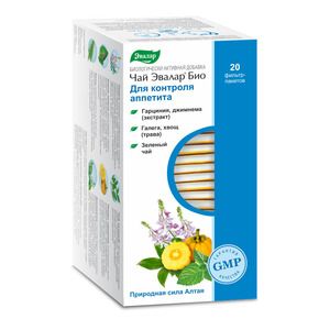 Чай Эвалар БИО для контроля аппетитаПоможет удержать аппетит под контролем и быстро устранить чувство голода1 отзывАктивное вещество:трава галеги, корни лопуха, трава хвоща, чай зеленый, экстракт гарцинии, экстракт джимненмыДействие:способствует снижению аппетита, помогает соблюдать диету и контролировать весКак работают ингредиенты?Улучшенный состав чая Эвалар БИО для контроля аппетита:Джимнемаспособствует снижению аппетита и уменьшает тягу к сладкой пище, обладает гепатопротекторными свойствами, снижает уровень холестерина и сахара в крови.Плоды гарцинии оказывают антиаллергическое, противовоспалительное действия. влияют на жировой обмен, применяются в программах для снижения веса.Галега снижает содержание сахара и холестерина в крови. Способствует нормализации водно-солевого баланса организма, углеводного и жирового обмена в тканях.Корни лопухарегулируют обмен веществ, улучшают состав крови и мочи, увеличивают диурез. Лопух содержит большое количество полисахаридов, вызывающих чувство насыщения.Хвощприменяется в качестве мочегонного средства, используется при поражениях капиллярных сосудов, содержит кремний.Чай зеленыйобладает тонизирующими свойствами. Р-витаминной активностью. увеличивает мочеотделение.Листья мяты обладают спазмолитическим, противовоспалительным, болеутоляющим действиями. Позволяют преодолеть стресс, способствующий перееданию и набору лишнего веса, даже сам аромат мяты помогает контролировать аппетит.Корица — хорошо известная пряность, обладает антисептическим действием, улучшает обмен веществ, используется в программах похудения.Солодкаоказывает противовоспалительное, противоаллергическое, детоксицирующее действия. Применяется при заболеваниях ЖКТ. Усиливает действие других компонентов, улучшает вкус.Достоинства чаев «Эвалар»: 100% натуральный состав. Большинство трав, входящих в состав, собираются на Алтае или выращиваются на собственных плантациях Эвалар в экологически чистых предгорьях Алтая без использования химикатов и пестицидов Высокая микробиологическая чистота чаев обеспечивается мягким способом обработки – «мгновенный пар» — на современной швейцарской установке. Для наилучшего сохранения целебных свойств, тонкого вкуса и аромата травяного чая каждый фильтр-пакет индивидуально упакован в многослойный защитный конверт Произведено Эвалар по стандарту GMP – гарантия качества, чистоты и эффективности