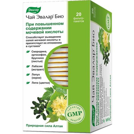 Чай Эвалар БИО при повышенном содержании мочевой кислоты- 100% натуральный составПри повышенном содержании мочевой кислотыОписание входящих компонентов:Смородина черная. Листья смородины обладают мочегонным, потогонным и противовоспалительным действием, освобождают организм от избытка мочевой кислоты и пуриновых веществ, поэтому часто употребляют в виде настоя или отвара при ревматизме и подагре. Приступы боли после курса лечения чаем из листьев становятся реже и протекают легче.Лопух большой. Настой корней лопуха применяют как мочегонное, потогонное средство при нарушении обмена веществ, почечнокаменной болезни, ревматизме, подагре.Ортосифон тычиночный. Настой листьев применяют как умеренное мочегонное средство, при мочекаменной болезни, холециститах, подагре.Липа. Цветки липы широко применяют в народной медицине различных стран как сильное потогонное, мочегонное, противосудорожное, противовоспалительное и обезболивающее средство. Настои и отвары нормализуют обменные процессы.Брусника обладает сильным мочегонным, регулирующим солевой обмен, противовоспалительным свойствами. Применяют препараты из растения при нарушениях минерального обмена (подагра), а также при заболеваниях почек и мочевого пузыря.Лабазник вязолистный оказывает вяжущее, противовоспалительное, бактерицидное, потогонное, общеукрепляющее действие. Настой травы и цветков лабазника применяется внутрь при простуде, в качестве мочегонного средства при заболеваниях почек, асцитах и нарушениях обмена веществ (подагре).2 фильтр-пакета в день обеспечивают не менее 14 мг флавоноидов в пересчете на рутин, что составляет 47 % от адекватного уровня потребления.