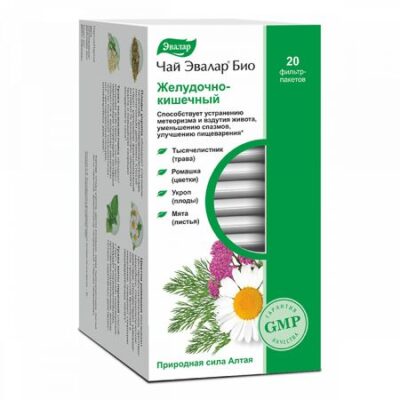 Чай Эвалар БИО желудочно-кишечный — 100% натуральный состав.Для желудочно-кишечного трактаОписание входящих компонентов:Ромашка аптечная оказывает противовоспалительное, спазмолитическое и обезболивающее действие при спазмах брюшной полости, воспалительных заболеваниях желудочно-кишечного трактаПлоды укропа оказывают противовоспалительное, спазмолитическое действие, улучшают функциональную активность желудочно-кишечного тракта. Отвары и настой плодов повышают секрецию желудочного сока, обладают желчегонным действием, поэтому применяются для улучшения аппетита и снижения чувства тяжести в области желудка после приема тяжелой пищиТрава тысячелистника обладает спазмолитическим, противовоспалительным, антимикробным, кровоостанавливающим, обезболивающим, вяжущим действием, нормализует секреторно-моторные процессы в желудочно-кишечном тракте, возбуждает аппетит. Средства на основе тысячелистника в связи с его горьким вкусом способствуют возбуждению секреции слюнных желез, усиливают секрецию желудочного сока, желчеотделения, уменьшают метеоризмЛистья мяты содержат эфирное масло, действующее спазмолитически в отношении гладкой мускулатуры желудочно-кишечного тракта, а кроме того обладающее желчегонным, ветрогонным и антибактериальным свойством. Мята перечная представляет собой натуральное средство, прежде всего при синдроме раздраженного желудка с функционально-спастическими явлениями2 фильтр-пакета в день обеспечивают не менее 9 мг флавоноидов в пересчете на рутин, что составляет 30 % от адекватного уровня потребления.
