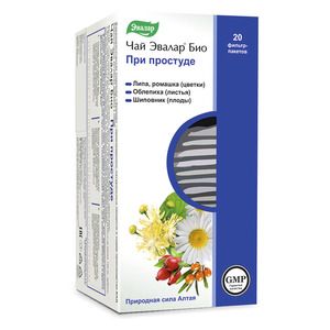 Чай Эвалар био при простуде — приятный травяной чай для бережной помощи при простуде Лекарственные растения, входящие в чай Эвалар БИО при простуде, способствуют скорейшему выздоровлению от простуды и поддержанию иммунитета.Как работают ингредиенты? Шиповник – кустарник семейства розоцветных (Rosaceae), используют его плоды, собранные и высушенные в период полного созревания. Применяют плоды различных видов шиповника (розы): шиповника майского (шиповника коричного) — R. majalis (R. cinnamomea), шиповника морщинистого — R. rugosa, шиповника даурского — R. davurica, шиповника иглистого — R. acicularis, шиповника собачьего — R. canina, и других видов розы. Действующие вещества: 0,2-5 % витамина С, каротиноиды, токоферолы, другие витамины (А, В, К, Р), минеральные вещества, органические кислоты — лимонная и яблочная, флавоноиды, дубильные вещества, сахара (до 24 %)Наличие указанных веществ делает шиповник ценным растением, чай из которого популярен как профилактическое средство от простуды, повышающее защитные силы организма.Кроме того, доказано его действие на надпочечники, то есть на образование важных для организма гормонов и, следовательно, на повышение жизненной силы. Если в иных чаях содержание витаминов обычно быстро снижается, то шиповниковый чай сохраняет витамины в полном составе в течение нескольких часов Облепиха – (Hippophae rhamnoides) — кустарник семейства лоховых (Elaeagnaceae). С лечебной целью используют плоды, семена, кору и листья.Листья содержат кумарины, тритерпеновые кислоты (урсоловую и олеаноловую), витамин С, витамины группы В, никотиновую кислоту, инозит, фолиевую кислоту, полифенолы, в т.ч. дубильные вещества Дубильные вещества (эллаготанины) обладают противовирусной активностью, в основе механизма действия эллаготанинов лежит направленный эффект на подавление жизненного цикла вирусных частиц. В результате уровень зараженных клеток в организме быстро снижается, что способствует восстановлению здорового состояния организма, дополнительно также они увеличивают уровень продукции интерферона, повышая его содержание в крови, что положительно сказывается на повышении сопротивляемости организма различным вирусным инфекциям Листья облепихи используют в травяных чаях в качестве витаминного и богатого флавоноидами компонента.В Китае из молодых листочков облепихи изготавливают новый перспективный чайный продукт, ферментируя их по технологии, аналогичной чайной Ромашка аптечная – (Chamomilla officinalis синоним Matricaria recutita) семейства астровых (сложноцветные) – Asteraceae – однолетнее травянистое растение.Для медицинских нужд заготавливают соцветия ромашки. Соцветия ромашки содержат эфирное масло, состоящее из основного биологически активного компонента – хамазулена, его предшественника – прохамазулена и других монотерпенов и сесквитерпенов. В эфирном масле найдены сесквитерпеновые углеводороды (фарнезен и кадинен), сесквитерпеновые спирты (бизаболол, бизабололоксид, кетоспирт), каприловая кислота. В цветках растения содержатся флавоноиды, кумарины, ситостерин, холин, каротин, аскорбиновая кислота и полисахариды Влияние препаратов ромашки на организм обусловлено комплексом фармакологических свойств содержащихся в растении физиологически активных веществ (эфирное масло, азулен, флавоноиды, полисахариды, витамины и др.).Препараты ромашки оказывают 