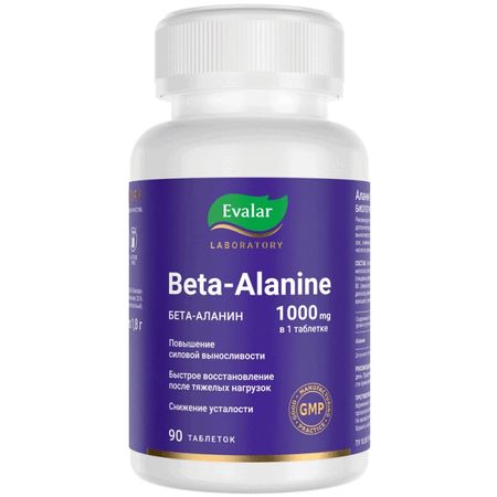 БЕТА-АЛАНИН 1000МГ (Beta-Alanin 1000 mg) — Биологически активная добавка (БАД) к пище — Бета-Аланин соединяется с аминокислотой гистидином, образуя дипептид, называемый карнозином. Со временем карнозин действует как буфер, помогая отсрочить появление молочной кислоты, тем самым снижая мышечную усталость, повышая выносливость и улучшая восстановление. Основной целью приема бета-аланина является увеличение содержания карнозина в скелетных мышцах, тем самым повышая внутриклеточную буферную способность, обеспечивая большую переносимость длительной анаэробной активности. Использование добавок бета-аланина помогает повысить уровень карнозина в организме до 80%. Повышая выносливость Бета-Аланин способствует более быстрому жиросжиганию за счет увеличения длительности тренировки. Аминокислота Бета-Аланин снижает количество и степень выраженности нейровегетативных симптомов и уменьшает степень выраженности психоэмоциональных симптомов у женщин в период менопаузы. Beta-Alanin от Evalar Laboratory — аминокислота, которая является производным аланина, играет значительную роль в производстве карнозина и пантотеновой кислоты. Beta-Alanin от Evalar Laboratory в активной бета-форме быстро всасывается и действует на клеточном уровне. Препарат содержит высокую дозировку в каждой таблетке 1000 мг. Beta-Alanin от Evalar Laboratory производится с помощью уникального технологичесого процесса: очистки от посторонних примесей с целью доведения качества бета-аланина до фармакопейного и представляет собой особый способ растворения сырья с последующей кристаллизацией для достижения максимальной чистоты компонента. Beta-Alanin от Evalar Laboratory выпускается в таблетках, созданных по технологии специального напыления. Шелковистая оболочка таблетки за счёт равномерного нанесения покрытия легко проглатывается и усваивается. Технология равномерного покрытия оболочки эксклюзивно применяется специалистами Evalar Laboratory для того, чтобы обеспечить легкость проглатывания и защитить ядро таблетки — активные компоненты от внешнего воздействия (влаги, света и тд). 3 таблетки Beta-Alanin от Evalar Laboratory содержат оптимальную суточную дозировку бета-аланина 3000 мг. Одной упаковки — 90 таблеток — вам хватит на полный месячный курс. УНИКАЛЬНОСТЬ КОМПОНЕНТОВ Beta-Alanin от Evalar Laboratory выпускается в уникальной Бета-форме, которая обладает эффектами повышения работоспособности и снижения мышечной усталости. А также обладает антиоксидантными, иммуностимулирующими и антивозрастными свойствами. Оболочка таблетки не содержит красителей и диоксида титана. Продукт можно применять вегетарианцам. Имеется сертификат веган. Содержание в 3 таблетках (суточном приеме) и % от рекомендуемого уровня суточного потребления (адекватного уровня): Бета-Аланин 3000 мг 45,5%