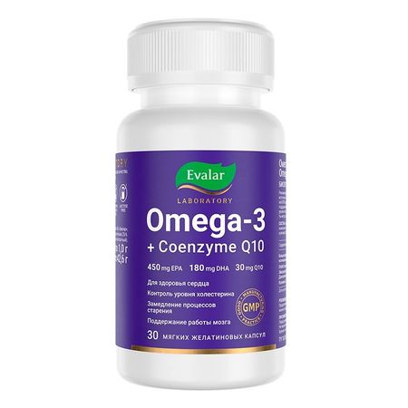 Омега-3 + Коэнзим Q10 / Omega-3 + Coenzyme Q10 — от Evalar Laboratory представляет собой оптимальное сочетание питательных веществ, направленных на поддержание здоровья сердца и всего организма. Специальные особенности: Без титана диоксида Без лактозы Без ГМО Без глютена В ходе производства мы используем уникальные запатентованные процессы очищения, которые гарантируют отсутствие загрязняющих веществ в препарате Омега-3 + Коэнзим Q10 от Evalar Laboratory. Чтобы предотвратить прогоркание капсул на всем периоде срока годности, препарата мы используем смесь натуральных токоферолов и ведем работы с концентрированным рыбьим жиром в безвоздушной среде азота. Каждая капсула Омега-3 + Коэнзим Q10 от Evalar Laboratory содержит оптимальную концентрацию коэнзима в высокоусвояемой форме убихинона и составляет 100% суточной нормы. Капсулы Омега-3 + Коэнзим Q10 удобно принимать: всего 1 капсула в день позволит вам поддержать здоровье сердца, мозга и глаз. Свойства: Препарат Омега-3 + Коэнзим Q10 от Evalar Laboratory выпускается в виде высокоэффективной двойной комбинации, содержащих в себе научно обоснованные дозировки компонентов: Полиненасыщенные жирные кислоты Омега-3: положительно влияют на понижение уровная липопротеинов низкой плотности (ЛПНП); способствуют нормализации соотношения холестерина и триглицеридов в крови. Коэнзим Q10 — витаминоподобное вещество (убихинон), помогает улучшить обменные процессы организма, обладает выраженными антиоксидантными свойствами. Все компоненты биологически активной добавки Омега-3 + Коэнзим Q10 от Evalar Laboratory производятся из сырья премиального качества, полученного от тщательно проверенных поставщиков. Например, Омега-3 для Омега-3 + Коэнзим Q10 препарата Evalar Laboratory производится из высокоочищенного натурального рыбьего жира. Сырьем для производства служат глубоководные рыбы, такие как анчоусы, лосось и сардины. Место вылова — Перу. Препарат Омега-3 + Коэнзим Q10 от Evalar Laboratory — это научно-обоснованная комбинация двух компонентов, созданная по фармакопейным стандартам и обладающая высокой эффективностью при приеме. При изготовлении капсул препарата используется говяжий желатин (halal). Уникальность: Омега-3 + Коэнзим Q10 от Evalar Laboratory — это уникальная комбинация с доказанной эффективностью, которая: • способствует поддержанию здоровья сердца и сосудов; • позволяет контролировать уровень холестерина в организме; • замедляет процессы старения; • оказывает положительное влияние на здоровье мозга и его когнитивные функции; • является частью антиоксидантной защиты организма. В препарате Омега-3 + Коэнзим Q10 от Evalar Laboratory используется натуральные триглицеридные формы эйкозапентаеновой (ЭПК) и докозагексаеновой (ДГК) кислот, которые хорошо усваиваются и эффективно воздействуют на организм. Чтобы препарат приносил максимальную пользу для здоровья сердца, мы выбрали оптимальное соотношение ЭПК И ДГК — (500:200). Омега-3 + Коэнзим Q10 от Evalar Laboratory выпускается в условиях фармацевтического производства, что позволяет нам гарантировать высочайшее качество препарата. Требования, предъявляемые к качеству концентрированного рыбьего жира, соответствуют американской и Европейской фармакопеям. Одной упаковки — 30 капсул — вам хватит на полный месячный курс. Область применения: поддержание здоровья сердца и сердечно-сосудистой системы; контроь уровня холестерина,