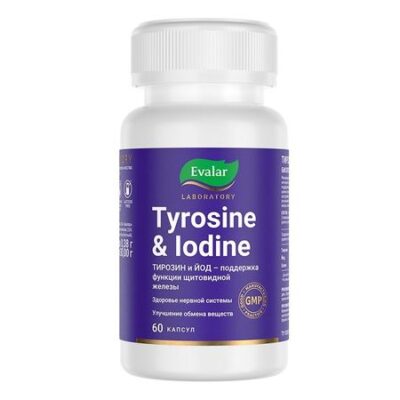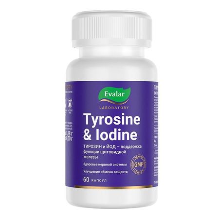 L-тирозин + йод от Evalar Laboratory – это комплекс активных компонентов для здоровья щитовидной железы, который содержит тирозин в L-форме и легкодоступные формы йода и селена (йодказеин и селексен). Высокая концентрация компонентов в суточном дозировке препарата: йод – более 166%, селен 100%. L-тирозин от Эвалар производится из высококачественного сырья шведского производителя.