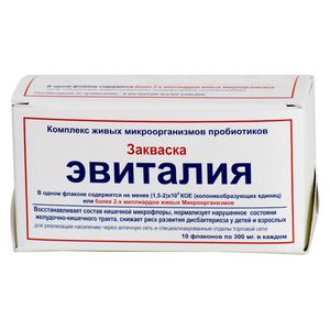 Показания к применениюПрименяется:Как диетическое питание.Для похудения.Для восстановления иммунной системы, выводит холестерин, радионуклиды, свободные радикалы.Способствует увеличению уровня гемоглобина в крови.В период эпидемии гриппа, стрессовых ситуаций, после интенсивного применения антибиотиков.В переходном возрасте.Активно подавляет кишечные инфекции.Эффективен в геронтологии.СоставЗакваска «Эвиталия» представляет собой лиофильно высушенные, но сохранившие способность размножаться в пищеварительном тракте, специальные штаммы молочнокислых и других микроорганизмов:Lactococcus lactis:Streptococcus thermоphilus:Lactobacillus acidophilus:Lactobacillus helveticus:Propionibacterium freudenreichii ssp. shermanii.&:n:А также продуценты витаминов:В1, В2, В6, В12, А, Е, С:фолиевую кислоту:микроэлементы железа:кальция:магния и др.