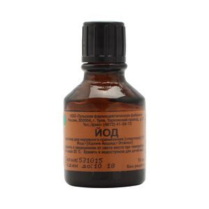 Показания к применениюВоспалительные заболевания кожи и слизистых оболочек, миозит, невралгии, атеросклероз.Применение при беременности и кормлении грудьюПротивопоказан для приема внутрь при беременности.ПротивопоказанияПовышенная чувствительность к йоду. Для приема внутрь — туберкулез легких, нефриты, нефрозы, аденомы (в т.ч. щитовидной железы), фурункулез, угревая сыпь, хроническая пиодермия, геморрагические диатезы, крапивница, беременность, детский возраст до 5 лет.Побочное действиеРаздражение кожи; при длительном применении на обширных раневых поверхностях — йодизм (ринит, крапивница, отек Квинке, слюнотечение, слезотечение, угревая сыпь).При приеме внутрь: кожные аллергические реакции, тахикардия, нервозность, нарушения сна, повышенная потливость, диарея (у пациентов старше 40 лет).СоставДействующее вещество: Йод (Iodine)Концентрация действующего вещества: 0,5 млВзаимодействие с другими препаратамиФармацевтически несовместим с эфирными маслами, растворами аммиака, белой осадочной ртутью (образуется взрывчатая смесь). Щелочная или кислая среда, присутствие жира, гноя, крови ослабляют антисептическую активность. Ослабляет гипотиреоидное и струмогенное влияние препаратов лития.