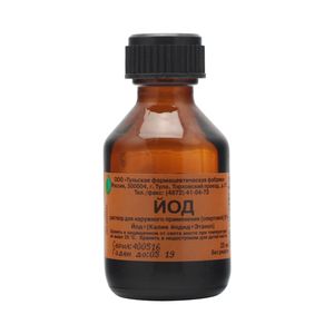 Показания к применениюВоспалительные и др. заболевания кожи и слизистых оболочек, ссадины, порезы, микротравмы, миозиты, невралгии, воспалительные инфильтраты, атеросклероз, сифилис (третичный), хронический атрофический ларингит, озена, гипертиреоз, эндемический зоб, хронические отравления свинцом и ртутью; дезинфекция кожи операционного поля, краев ран, пальцев хирурга.ПротивопоказанияГиперчувствительность; для приема внутрь — туберкулез легких, нефрит, фурункулез, угревая сыпь, хроническая пиодермия, геморрагический диатез, крапивница; беременность, детский возраст (до 5 лет).Побочное действиеЙодизм (насморк, кожные высыпания по типу крапивницы, слюнотечение, слезотечение и др.).СоставЙод 5 г.Вспомогательные вещества: калия йодид, этанол 95%.