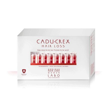 CADU-CREX Hair Loss — новая уникальная трансдермальная технология против выпадения волос. Формула препарата разработана специально для женщин. Упаковка содержит ампулы красного цвета и предназначается для лечения выпадения волос, воздействуя на фолликулярные островки. Препарат эффективен при облысении, не связанным с патологическими причинами. Лосьон CADU-CREX Hair Loss против выпадения волос содержит запатентованные молекулы комплекса Crescina Hair Follicular Islands: гликоген, люпин белый, глутамил-амидо-этил-индол, пролин, пшеницу обыкновенную + сою + шлемник байкальский, а также содержит активные компоненты (гидроксипролин, аспаргиновую кислоту и таурин), улучшающие эластичность стенок фолликула. Активатор ферментов повышает скорость ферментативных реакций, стимулирует обменные процессы в клетках волосяного фолликула. Комплекс HSSC предотвращает преждевременную потерю волос. Более того, добавлены 3 молекулы, усиливающие проникновение активных компонентов. Пентилен гликоль Децилен гликоль Каприлил гликоль Благодаря запатентованной Labo трансдермальной технологии активные молекулы проникают не только через фолликулярный остий (4,6%), но и через всю поверхность кожи головы (95,4%). Каждая ампула содержит 3,5 мл препарата CADU-CREX Hair Loss. Применять ежедневно в течение 5 дней подряд (например, первые 5 дней недели), затем перерыв — 2 дня. Упаковка 20 ампул рассчитана на курс 1 месяц. Упаковка 40 ампул рассчитана на курс 2 месяца.