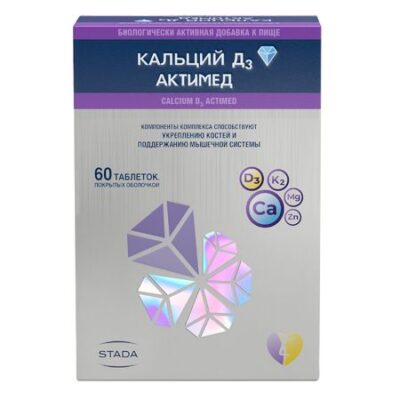 Кальций Дз Актимед — для укрепления костей, тонуса мышц и новых побед! — умное распределение кальция в организме там, где это действительно необходимо (за счёт витамина К2 в составе); — простой приём – 1 таблетка в день запивается водой; — 2 полных курса в 1-ой упаковке. В составе: Ca — для минерализации костей и зубов, D3 — для лучшего усвоения Ca, К2 — оптимизирует распределение Са в организме, доставляя его из кровотока в кости и мышцы, Mg — вместе с Са поддерживают тонус мышц, Zn — вместе с Mg поддерживают активность и нормальную работу организма. Подходит для взрослых людей, нуждающихся в поддержке активности. Принимается курсом не менее месяца, при необходимости курс можно повторить.