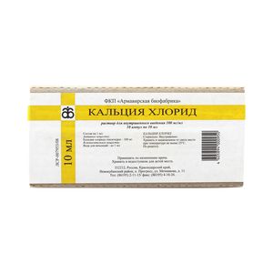 Показания к применению- Аллергические заболевания (крапивница ангионевротический отек аллергодерматозы сывороточная болезнь);- гипокальциемия (в том числе гипокальциемическая тетания при гипопаратиреозе);- свинцовая колика;- гиперкалиемия;- передозировка солями магния (в составе комплексной терапии).Применение при беременности и кормлении грудьюПротивопоказано применение препарата при беременности и в период грудного вскармливания.При необходимости применения препарата в период лактации грудное вскармливание следует прекратить.ПротивопоказанияГиперчувствительность к компонентам препарата гиперкальциемия тяжелая хроническая почечная недостаточность фибрилляция желудочков мочекаменная болезнь гиперкальциурия саркоидоз выраженный атеросклероз склонность к тромбообразованию одновременный прием с сердечными гликозидами беременность период грудного вскармливания.С осторожностью:Хроническая почечная недостаточность легкой и средней тяжести дегидратация нарушение электролитного баланса (риск гиперкальциемии) заболевания сердца (риск аритмии) заболевания почек "легочное" сердце респираторный ацидоз дыхательная недостаточность (риск токсических реакций вследствие окисления кальция) детский возраст.Побочное действиеСо стороны сердечно-сосудистой системы: периферическая вазодилатация снижение артериального давления аритмия (в том числе брадикардия). При быстром введении возможны фибрилляция желудочков сердца сердечно-сосудистая недостаточность вплоть до остановки сердца.Со стороны центральной нервной системы: обморок.Со стороны пищеварительной системы: тошнота.Со стороны мочевыделительной системы: редко (при нарушении функции почек) — гиперкальциемия.Прочие: возможно ощущение жара сначала в полости рта а затем по всему телу привкус мела во рту.Местные реакции: раздражение по ходу вены; гиперемия кожи боль сыпь кальцификация могут свидетельствовать об экстравазации которая может приводить к некрозу окружающих тканей. При попадании в подкожную клетчатку и в мышцу вызывает сильное раздражение и некроз окружающих тканей.СоставНа 1 мл:Действующее вещество: кальция хлорида гексагидрат — 100,0 мг или кальция хлорида дигидрат — 67,1 мг (в пересчете на кальция хлорида гексагидрат — 100,0 мг).Вспомогательные вещества: вода для инъекций — до 1 мл.