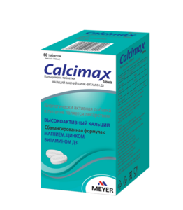 КАЛЬЦИМАКС («Calcimax Tablets») — Биологически активная добавка (БАД) к пище — минеральный комплекс восполняющий кальций.Суточное поступление (2 таблетки):Кальций 800 мгМагний 200 мгЦинк 8 мгВитамин Д3 400 МЕ (10 мкг)Кальций составляет основу костной ткани, обеспечивает мышечное сокращение и передачу импульса в нервной системе, принимает участие в активации некоторых гормонов, свертывании крови.Магний необходим для всех клеток и тканей, участвует в обмене фосфора, углеводов, в процессах сокращения и расслабления мышц. Наряду с кальцием обеспечивает прочность костей.Витамин D регулирует минеральный обмен и способствует отложению кальция в костной ткани и дентине, препятствуя снижению прочности костей.