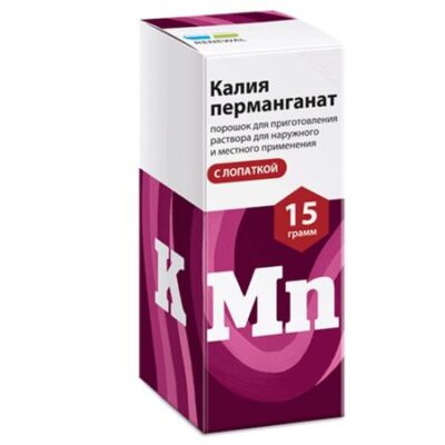 Фармакологическое действие Антисептическое средство. При соприкосновении с органическими веществами выделяет атомарный кислород. Образующийся при восстановлении калия перманганата марганца оксид образует с белками комплексные соединения — альбуминаты (за счет этого калия перманганат в малых концентрациях оказывает вяжущее, а в концентрированных растворах — раздражающее, прижигающее и дубящее действие). Обладает также дезодорирующим эффектом. Эффективен при лечении ожогов и язв. Способность калия перманганата обезвреживать некоторые яды лежит в основе использования его растворов для промывания желудка при отравлениях. При попадании внутрь всасывается, оказывая гематотоксическое действие (приводит к развитию метгемоглобинемии). Показания Промывание ран, язв, ожогов; спринцевание и промывание в гинекологической и урологической практике; полоскание полости рта и горла при инфекционно-воспалительных заболеваниях полости рта и горла (в т.ч. при тонзиллитах, фарингитах; промывание желудка при отравлениях, вызванных приемом внутрь алкалоидов (морфин, аконитин, никотин), синильной кислотой, фосфором, хинином; кожи — при попадании на нее анилина; глаз — при поражении их ядовитыми насекомыми.