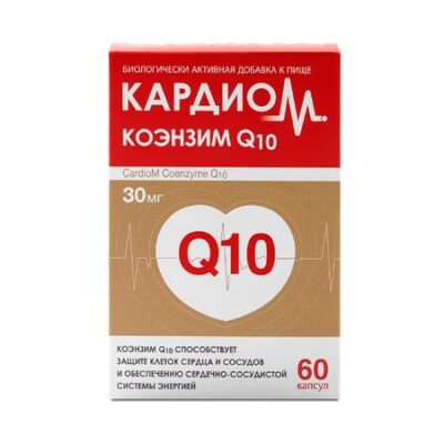 КардиоМ Коэнзим Q10 — БАД для сохранения здоровья сердечно-сосудистой системы и защите сосудистых стенок от повреждений свободными радикалами. Участвует в производстве клеточной энергии, необходимой для обновления клеток и обеспечения метаболических процессов в организме, в том числе сердца Способствует нормализации кровообращения и сократительной функции сердца Суточная дозировка Коэнзим Q10 составляет 30 мг — это оптимальная дозировка для ежедневного долговременного применения в стандартных жизненных ситуациях.