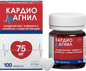 Показания к применению— первичная профилактика сердечно-сосудистых заболеваний, таких как тромбоз и острая сердечная недостаточность при наличии факторов риска (например, сахарный диабет, гиперлипидемия, артериальная гипертензия, ожирение, курение, пожилой возраст); — профилактика повторного инфаркта миокарда и тромбоза кровеносных сосудов; — профилактика тромбоэмболии после хирургических вмешательств на сосудах (аортокоронарное шунтирование, чрескожная транслюминальная коронарная ангиопластика); — нестабильная стенокардия.Применение при беременности и кормлении грудьюПрименение салицилатов в высоких дозах в I триместре беременности ассоциируется с повышенной частотой дефектов развития плода. Во II триместре беременности салицилаты можно назначать только с учетом строгой оценки риска и пользы. В III триместре беременности салицилаты в высокой дозе (>300 мг/сут) вызывают торможение родовой деятельности, преждевременное закрытие артериального протока у плода, повышенную кровоточивость у матери и плода, а назначение непосредственно перед родами может вызвать внутричерепные кровоизлияния, особенно у недоношенных детей. Назначение салицилатов в III триместре беременности противопоказано. Доступных клинических данных недостаточно для установления возможности или невозможности применения препарата в период грудного вскармливания. Перед назначением ацетилсалициловой кислоты в период грудного вскармливания следует оценить потенциальную пользу терапии препаратом относительно потенциального риска для детей грудного возраста.Противопоказания— кровоизлияние в головной мозг; — склонность к кровотечениям (недостаточность витамина К, тромбоцитопения, геморрагический диатез); — бронхиальная астма, индуцированная приемом салицилатов и НПВС; — эрозивно-язвенное поражение ЖКТ (в фазе обострения); — желудочно-кишечное кровотечение; — почечная недостаточность тяжелой степени (КК меньше 10 мл/мин); — дефицит глюкозо-6-фосфатдегидрогеназы; — одновременный прием с метотрексатом (>15 мг в неделю); — I и III триместры беременности; — период лактации (грудного вскармливания); — детский и подростковый возраст до 18 лет; — повышенная чувствительность к ацетилсалициловой кислоте, вспомогательным веществам препарата и другим НПВС. С осторожностью следует назначать препарат при подагре, гиперурикемии, наличии в анамнезе язвенных поражений ЖКТ или кровотечений из ЖКТ, при почечной и/или печеночной недостаточности, бронхиальной астме, сенной лихорадке, полипозе носа, аллергических состояниях, во II триместре беременности.СоставАцетилсалициловая кислота 75 мг магния гидроксид 15.2 мг Вспомогательные вещества: крахмал кукурузный — 9.5 мг, целлюлоза микрокристаллическая — 12.5 мг, магния стеарат — 150 мкг, крахмал картофельный — 2.0 мг. Состав оболочки: гипромеллоза (метилгидроксипропилцеллюлоза 15) — 460 мкг, пропиленгликоль — 90 мкг, тальк — 280 мкг.