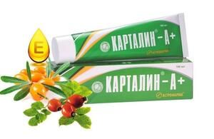 Крем «Карталин®- А+» — Густая вязкая масса от желто-коричневого до оранжево-коричневого цвета со специфическим запахом.Крем «Карталин®- А+» — крем негормонального происхождения, обогащенный активными веществами, это новое средство усиленного действия, имеющее антиоксидантную направленность и высокую степень биодоступности, обусловленную входящими в его состав компонентами:Облепиховое масло — является средством растительного происхождения и источником витаминов А, Е, F, К. Оказывает регенерирующее действие на кожу, обладает общеукрепляющим, противовоспалительным и антиоксидантным действием.Масло шиповника — стимулирует обновление и восстановление тканей, улучшение и выравнивание цвета и текстуры кожи, эффективно при дерматологических проблемах. Масло шиповника стимулирует местный и общий иммунитет и сопротивляемость организма, оказывает общеукрепляющее и восстанавливающее воздействие, усиливает регенерацию тканей.Витамин Е (токоферол) — мощный природный антиоксидант. Защищает клетки от свободных радикалов, стимулирует иммунитет, регулирует белковый обмен, обладает противовоспалительным действием.Изопропилметилфенол — изомер тимола (основного компонента эфирных масел растений семейства Губоцветных), обладает ярко выраженными антиоксидантными и антибактериальными свойствами.Совокупность всех ингредиентов, входящих в состав Крема «Карталин®- А+» обеспечивает высокий эффект и хорошую впитываемость* (*- по сравнению с кремом «Карталин®»), не вызывая побочных явлений или осложнений.Клинические испытания, проведенные в ИЛЦ Новосибирского НИИ гигиены показали, что Крем «Карталин®- А+» хорошо переносится. Кожно-раздражающего действия не оказывает, нормализует липидный слой кожи, приводя его в состояние физиологической нормы, обладает восстанавливающим роговой слой кожи действием. Визуально оказывает выраженное противовоспалительное, заживляющее, выравнивающее действие.