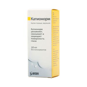 Катионорм — умное решение для людей с синдромом «сухого глаза».Внешний вид и свойства:Катионорм представляет собой глазную гипотоническую эмульсию (pH 5.0-7.5) в виде жидкости молочного цвета, не содержащую консервантов.Увлажнение и защита глазной поверхности: Восстанавливает все 3 слоя слезной пленки, препятствуя дальнейшему развитию заболевания Представляет из себя катионную эмульсию, которая равномерно распределяется и удерживается на глазной поверхностиПереносимость: Без консервантов Гипотонический раствор снижает повреждающее действие солей в гипертоничной слезеУдобство применения: Катионорм не влияет на качество контактных линз Удобный флакон с коротким носикомПринцип действия: Катионорм увлажняет, смазывает и защищает поверхность глаза.Катионорм:Восстанавливает липидный слой, за счет уменьшения испарения слезы и стабилизации слёзной плёнки.Восполняет водный слой слёзной плёнки, увлажняя роговицу.Облегчает скольжение век при мигательных движениях, способствуя восстановлению муцинового слоя слёзной плёнки и защищая поверхность глаза.Катионная эмульсия равномерно распределяется и удерживается на глазной поверхности.Катионорм способствует устранению и облегчению симптомов «синдрома сухого глаза».