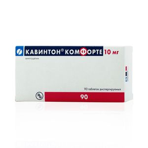 Показания к применениюНеврология: — симптоматическая терапия последствий ишемического инсульта, сосудистой вертебробазилярной недостаточности, сосудистой деменции, атеросклероза сосудов головного мозга, посттравматической, гипертонической энцефалопатии.;Офтальмология: — хронические сосудистые заболевания сетчатки и сосудистой оболочки глаза.;Отология: — снижение слуха перцептивного типа; — болезнь Меньера; — шум в ушах.Применение при беременности и кормлении грудьюВинпоцетин проникает через плацентарный барьер и поэтому противопоказан при беременности. При этом его концентрация в плаценте и в крови плода ниже, чем в крови беременной. При высоких дозах возможно плацентарное кровотечение и спонтанные аборты, вероятно в результате усиления плацентарного кровоснабжения.;В течение часа в грудное молоко проникает 0.25% принятой дозы препарата. При применении препарата необходимо прекратить грудное вскармливание.Противопоказания— острая фаза геморрагического инсульта; — тяжелая форма ИБС; — тяжелые аритмии; — фенилкетонурия; — беременность; — период лактации (кормления грудью); — детский и подростковый возраст до 18 лет (в связи с недостаточностью данных); — известная гиперчувствительность к винпоцетину и другим компонентам препарата.СоставВинпоцетин 10 мг;Вспомогательные вещества: маннитол — 75.6 мг, крахмал кукурузный прежелатинизированный — 38 мг, бутилметакрилата сополимер — 9 мг, гипролоза низкозамещенная — 8 мг, кросповидон — 8 мг, магния стеарат — 2.85 мг, натрия стеарилфумарат — 2.8 мг, кремния диоксид коллоидный — 1.6 мг, аспартам — 1.28 мг, стеариновая кислота — 1.26 мг, натрия лаурилсульфат — 0.9 мг, диметикон — 0.39 мг, ароматизатор апельсиновый — 0.32 мг.Взаимодействие с другими препаратамиВзаимодействия не наблюдается при одновременном применении с бета-адреноблокаторами (хлоранолол, пиндолол), клопамидом, глибенкламидом, дигоксином, аценокумаролом, гидрохлоротиазидом и имипрамином.;Одновременное применение винпоцетина и метилдопы иногда вызывало некоторое усиление гипотензивного эффекта, поэтому при таком лечении требуется регулярный контроль АД.;Несмотря на отсутствие данных, подтверждающих возможность взаимодействия, рекомендуется проявлять осторожность при одновременном назначении Кавинтон; Комфорте с препаратами центрального, противоаритмического и антикоагулянтного действия.