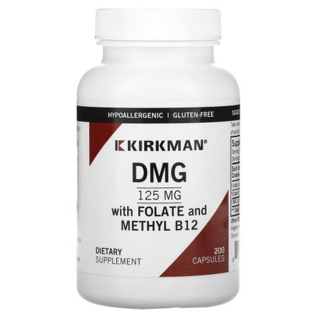 Информация о добавкахServing Size: 1 CapsuleServings Per Container: 200 Amount Per Serving%Daily ValueFolate ( as Calcium Folinate)666 mcg DFE167%Vitamin B-12 (Methylcobalamin)6 mcg250%DMG ( as Dimethylglycine Hydrochloride)125 mg****Daily Value not established. Содержит фолиевую кислоту и метил B-12 Гипоаллергенный продукт Ультра-контроль — проверено на содержание более чем 950 загрязняющих веществ — тяжелые металлы, бактерии, дрожжи, пестициды и другое. Пищевая добавка Без казеина и глютенаПоддерживает метилирование и другие процессы организма, является модулятором иммунной системы. Содержит фолиновую кислоту, форму фолиевой кислоты, более подходящую для некоторых людей. Фолиевая кислота необходима для бихомической работы ДМГ (диметилглицина) в организме. Метилкобаламин (витамин B-12) включен потому, что фолиевая кислота часто может маскировать недостаток витамина B-12. Гипоаллергенный. Не содержит глютена и казеина. Капсулы на растительной основе. Прошел тщательные испытания.Диметилглицин поддерживает метилирование, метиониновый метаболизм, химический состав фолатов и является модулятором иммунной системы.ДМГ от Kirkman изготавливается из диметилглицина гидрохлорида.Диметилглицин является безбелковой аминокислотой, присутствующей в растительных и животных клетках. Диметилглицин можно считать “донором ” или “банком” метила. В организме с помощью коэнзима рибофлавина, диметилглицин снабжает метиловые группы, присоединенные к фолиевой кислоте, чтобы сформировать метилентетрагидрофолат, важный компонент многих биохимических процессов в организме, включая чувствительность и реакцию клеток. Он также участвует в поддержании здорового уровня гомоцистеина.