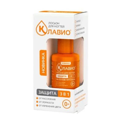 КЛАВИО® лосьон для ногтей «Защита 3 в 1» специально разработан для защиты от расслоения и поддержания здоровья ногтей.• от расслоения• от ломкости• от изменения цвета Ногти, как и наша кожа, нуждаются во влаге, питательных веществах и микроэлементах. Возрастные изменения, контакты с бытовой химией, использование средств ногтевого сервиса, недостаток витаминов или минералов в организме могут сделать ногти уязвимыми. В результате ногти могут, расслаиваться, истончаться, тускнеть, легко ломаться, терять гладкость, эластичность и блеск, пересыхать. Чтобы предотвратить нежелательные изменения, ногти требуют защиты и ухода.Лосьон для ногтей «Защита 3 в 1» КЛАВИО® подходит для младенцев, детей и взрослых.Механизм действия и активные компоненты:Основой лосьона КЛАВИО® является хитозан – биологический полимер, способствующий выравниванию структуры ногтевой пластины и защищающий ее от проникновения внешних агрессивных веществ и потери влаги.Д-пантенол (витамин группы В) увлажняет и улучшает процессы восстановления клеток ногтевого ложа. Витамин Е – обладает антиоксидантным эффектом, защищает ногти от вредных влияний агрессивных веществ, замедляет процессы старения.Биологическая сера глубоко проникает в ногтевую пластину, укрепляет ее за счет синтеза кератина.Экстракт апельсина — улучшает регенерацию клеток, препятствует возникновению свободных радикалов, обладает отбеливающим эффектом, осветляет ногти и придает блеск ногтям.