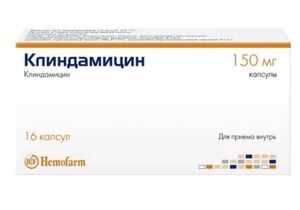 Показания к применениюИнфекционно-воспалительные заболевания, вызванные чувствительными к клиндамицину микроорганизмами: инфекции верхних дыхательных путей и инфекции ЛОР-органов (фарингит, тонзиллит, синусит, отит), нижних дыхательных путей (пневмония, в т.ч. аспирационная, абсцесс легкого, эмпиема плевры, бронхит), скарлатина, дифтерия, инфекции урогенитального тракта (хламидиоз, эндометрит, вагинальные инфекции, тубоовариальное воспаление), инфекции кожи и мягких тканей (инфицированные раны, абсцессы, фурункулы, панариций), брюшной полости (перитонит, абсцесс), полости рта, острый и хронический остеомиелит, септицемия (прежде всего анаэробная), бактериальный эндокардит. Профилактика перитонита и внутрибрюшных абсцессов после прободения кишечника или в результате травматического инфицирования (в комбинации с аминогликозидами).ПротивопоказанияГиперчувствительность, миастения, бронхиальная астма, язвенный колит (в анамнезе), диарея, беременность, период лактации, редкие наследственные заболевания, такие как: непереносимость галактозы, дефицит лактазы или глюкозо-галактозная мальабсорбция (для капсул), детский возраст до 8-ми лет для капсул (средний вес ребенка менее 25 кг).Побочное действиеСо стороны желудочно-кишечного тракта: диспепсия (боли в животе, тошнота, рвота, диарея), эзофагит, желтуха, нарушения функции печени, гипербилирубинемия, дисбактериоз, псевдомембранозный энтероколит. Со стороны опорно-двигательного аппарата: редко — нарушение нервно-мышечной проводимости. Со стороны органов кроветворения: лейкопения, нейтропения, агранулоцитоз, тромбоцитопения. Аллергические реакции: редко — макулопапулезная сыпь, крапивница, зуд, в отдельных случаях эксфолиативный и везикулобуллезный дерматит, эозинофилия, анафилактоидные реакции. Со стороны сердечно-сосудистой системы: при быстром внутривенном введении — снижение артериального давления, вплоть до коллапса, головокружение, слабость. В месте инъекции возможны: раздражение, болезненность (в месте в/м инъекции), тромбофлебит (в месте в/в инъекции). Прочие: развитие суперинфекции.Состав1 капсула содержит: действующее вещество: клиндамицина 150 мг (в форме клиндамицина гидрохлорида), вспомогательные вещества: кукурузный крахмал — 35,00 мг, лактозы моногидрат — q.s., тальк — 15,00 мг, магния стеарат — 3,00 мг, оболочка капсулы: корпус капсулы: краситель азорубин Е 122 — 0,036945 мг, краситель бриллиантовый черный Е 151 — 0,013815 мг, желатин — до 45 мг, крышечка капсулы: титана диоксид E 171 — 0,24 мг, краситель хинолиновый желтый Е 104 — 0,02529 мг, краситель азорубин Е 122 — 0,1314 мг, краситель пунцовый [Понсо 4R] Е 124 — 0,02184 мг, краситель бриллиантовый черный Е 151 — 0,00231 мг, желатин — до 30 мг.