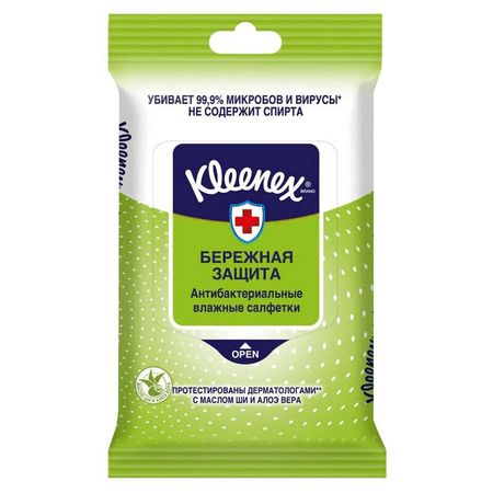 Kleenex (Клинекс БЕРЕЖНАЯ ЗАЩИТА) антибактериальные влажные салфетки для рук. Форма выпуска: Индивидуальная мягкая упаковка с многоразовым клапаном содержит 10 влажных салфеток. Условия хранения: хранить при комнатной температуре, в недоступном для детей месте, избегать попадания прямых солнечных лучей. Срок годности 2 года. Производитель: KIMBERLY-CLARK. Произведены в Республике Корея.