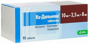 Главная » Аптека Ко-дальнева Таблетки 10 мг + 2,5 мг + 8 мг 90 шт Просмотров 9 Антигипертензивный препарат. КРКА