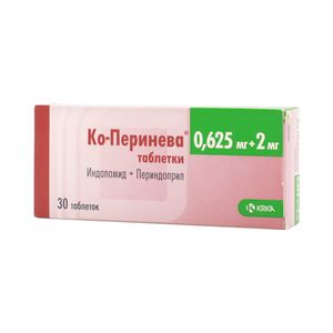 Показания к применениюПрепарат Ко-Перинева показан к применению у взрослых. Эссенциальная гипертензия. У пациентов с артериальной гипертензией и сахарным диабетом 2 типа для снижения риска развития микрососудистых осложнений (со стороны почек) и макрососудистых осложнений от сердечно-сосудистых заболеваний.Противопоказания- ангионевротический отек в анамнезе (наследственный/идиопатический или ангионевротический отек на фоне приема других ингибиторов АПФ в анамнезе);- гипокалиемия;- выраженная почечная недостаточность (КК менее 30 мл/мин);- двусторонний стеноз почечных артерий, стеноз артерии единственной почки;- рефрактерная гиперкалиемия;- тяжелая печеночная недостаточность (в т.ч. с энцефалопатией);- непереносимость лактозы, дефицит лактазы или глюкозо-галактозная мальабсорбция;- одновременное применение препаратов, удлиняющих интервал QT на ЭКГ;- одновременное применение с антиаритмическими препаратами, способными вызывать желудочковую тахикардию по типу пируэт;- беременность;- период грудного вскармливания;- возраст до 18 лет (эффективность и безопасность не установлены);- повышенная чувствительность к действующим веществам, любому ингибитору АПФ, производным сульфонамида или любым вспомогательным компонентам препарата.Учитывая отсутствие достаточного клинического опыта применения, препарат Ко-Перинева не следует применять у пациентов, находящихся на диализе, и у пациентов с нелеченной декомпенсированной сердечной недостаточностью.С осторожностью следует применять препарат при системных заболеваниях соединительной ткани (в т.ч. системная красная волчанка, склеродермия); на фоне терапии иммунодепрессантами (риск развития нейтропении, агранулоцитоза); при угнетении костномозгового кроветворения; снижении ОЦК (прием диуретиков, бессолевая диета, рвота, диарея); при стенокардии; цереброваскулярных заболеваниях; реноваскулярной гипертензии; сахарном диабете; хронической сердечной недостаточности (IV функциональный класс по классификации NYHA); при гиперурикемии (особенно сопровождающейся подагрой и уратным нефролитиазом); лабильности АД; при гемодиализе с использованием высокопроточных полиакрилнитриловых мембран; перед процедурой афереза ЛПНП; одновременно с проведением десенсибилизирующей терапии аллергенами (например, ядом перепончатокрылых); при состоянии после трансплантации почек; стенозе аортального и/или митрального клапана; гипертрофической обструктивной кардиомиопатии; у пациентов пожилого возраста.СоставПериндоприла эрбумин к полуфабрикат-гранулы 37.515 мг, что соответствует содержанию периндоприла эрбумина 2 мгиндапамид 0.625 мгвспомогательные вещества полуфабриката гранул: кальция хлорида гексагидрат — 0.6 мг, лактозы моногидрат — 30.915 мг, кросповидон — 4 мг.вспомогательные вещества: целлюлоза микрокристаллическая — 11.25 мг, натрия гидрокарбонат — 0.25 мг, кремния диоксид коллоидный — 0.135 мг, магния стеарат — 0.225 мг.