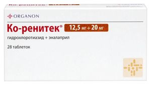 Показания к применениюЛечение артериальной гипертензии у пациентов, которым показана комбинированная терапия.Применение при беременности и кормлении грудьюНе рекомендуется применение препарата Ко-ренитек при беременности. При установленной беременности прием препарата следует немедленно прекратить. Назначение ингибиторов АПФ во II и III триместрах беременности может вызывать заболевание или гибель плода или новорожденного. Отрицательное влияние ингибиторов АПФ на плод и новорожденного проявляется артериальной гипотензией, почечной недостаточностью, гиперкалиемией и/или гипоплазией черепа. Возможно развитие олигогидрамниона, по-видимому, вследствие нарушения функции почек плода. Это осложнение может приводить к контрактуре конечностей, деформации черепа, включая его лицевую часть, к гипоплазии легких. Применение диуретиков у женщин при беременности не рекомендуется, поскольку при этом имеется риск развития желтухи у плода и новорожденного, тромбоцитопении и, возможно, других побочных эффектов, наблюдавшихся у взрослых пациентов. Если Ко-ренитек назначают при беременности, то пациентку следует предупредить о существующем потенциальном риске для плода. В тех редких случаях, когда назначение препарата при беременности считается необходимым, следует проводить периодические ультразвуковые обследования для оценки состояния плода, а также интраамниотического пространства. Новорожденных, чьи матери принимали Ко-ренитек, следует тщательно наблюдать в отношении развития артериальной гипотензии, олигурии и гиперкалиемии. Эналаприл, который проникает через плацентарный барьер, удалялся из кровообращения новорожденного с помощью перитонеального диализа с некоторым благоприятным клиническим эффектом, теоретически он может быть удален посредством обменного переливания крови. Эналаприл и тиазиды, в т.ч. Гидрохлоротиазид, выделяются с грудным молоком. При необходимости применения препарата в период лактации грудное вскармливание следует прекратить.Противопоказания Анурия Повышенная чувствительность к любому из компонентов препарата Повышенная чувствительность к производным сульфонамидов Ангионевротический отек в анамнезе, связанный с назначением ранее ингибиторов АПФ, а также наследственный или идиопатический ангионевротический отек СоставДействующее вещество: Гидрохлоротиазид + Эналаприл (Hydrochlorothiazide + Enalapril). Концентрация действующего вещества (мг): Эналаприла малеат 20 мг, гидрохлоротиазид 12. 5 мг.