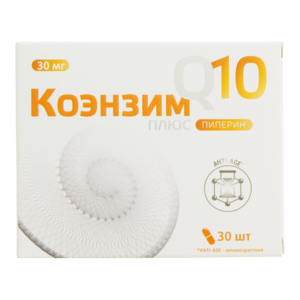 «Коэнзим Q10 Плюс» — биологически активная добавка к пище, содержащая в себе уникальный антиоксидант, который в комбинации с экстрактом черного перца (пиперином) способствует сохранению здоровья, молодости и красоты, свежести и упругости кожи, благотворно влияет на состояние мозга, мышц,сердечно-сосудистой системы.Внешний вид: Твердая бесцветная капсула с порошком желто-оранжевого цветаКоэнзим Q10 ПлюсКомпоненты, входящие в состав комплекса, способствуют: поддержке работы сердца выработке энергии замедлению процессов старенияКоэнзим Q10 (убихинон) является активным коферментом, участвующим главным образом в энергопродукции и антиоксидантной защите клеток. Его нормальное содержание в митохондриях обеспечивает стабильную работу всего организма. Однако после 30 лет синтез этого соединения в организме заметно снижается, что приводит к нарушению работы сердечно-сосудистой системы, ухудшению образования энергии и активации процессов старения. Поэтому дополнительное потребление коэнзима Q10 совместно с пиперином, усиливающим его биодоступность, способствует поддержанию активного образа жизни.Содержание в 1 капсуле КоэнзимQ10 30 (±10 %) мгПиперин 2 (±20 %) мгИнформация о биологически активных веществах и их свойствах:Коэнзим Q10 (убихинон) представляет собой кофермент, повсеместно присутствующий в пище и клетках организма человека. Основная его роль сводится к участию в процессе синтеза главного энергетического субстрата — АТФ (аденозинтрифосфорной кислоты) и выработке энергии в митохондриях, специализированных клеточных образованиях. Таким образом, нутриент содействует улучшению энергетического метаболизма, в том числе повышению выносливости во время физических нагрузок.Не менее важна другая функция убихинона — антиоксидантная. Обезвреживая свободные радикалы, которые приводят к перекисному окислению, он помогает уменьшить степень повреждения митохондрий.Поскольку коэнзим Q10 необходим в первую очередь для выработки энергии, особенное значение это соединение имеет для поддержания нормальной работы сердца. В частности, благодаря его активности улучшаются сократительная способность миокарда (сердечной мышцы) и сосудистый кровоток. Кроме того, сохраняя дыхательную активность клеток и их энергоснабжение, кофермент способствует замедлению процессов старения.Пиперин — вещество, содержащееся в черном перце (Piper nigrum L.). Благодаря воздействию на рецепторы тонкой кишки этот нутрицевтик повышает биодоступность (усвояемость организмом) многих веществ, в том числе коэнзима Q10.