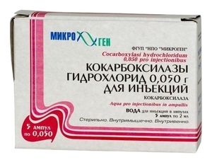 Показания к применениюКофермент, образующийся в организме из тиамина. Оказывает метаболическое действие, активирует тканевой обмен. В организме фосфорилируется с образованием моно-, ди- и трифосфорных эфиров, кокарбоксилаза входит в состав ферментов, катализирующих карбоксилирование и декарбоксилирование кетокислот, пировиноградной кислоты, способствует образованию ацетил-коэнзима А, что определяет ее участие в углеводном обмене. Участие в пентозном цикле опосредованно способствует синтезу нуклеиновых кислот, белков и липидов. Улучшает усвоение глюкозы, трофику нервной ткани, способствует нормализации функций сердечно-сосудистой системы. Дефицит кокарбоксилазы вызывает повышение уровня пировиноградной и молочной кислот в крови, что приводит к ацидозу и ацидотической коме.ПротивопоказанияВзрослым вводят в/м или в/в. Доза составляет 50-200 мг/сут. При сахарном диабете (ацидоз, кома) суточная доза может составлять 0.1-1 г. Частота и длительность применения зависит от показаний. Детям — в/м, в/в (капельно или струйно), новорожденным — сублингвально. Детям до 3 мес — 25 мг/сут, от 4 мес до 7 лет — 25-50 мг/сут, от 8 до 18 лет — 50-100 мг/сут. Длительность лечения — от 3-7 до 15 дней.СоставКокарбоксилазы гидрохлорид 50 мг, Растворитель: вода д/и — 2 мл.