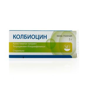 Показания к применению конъюнктивиты (катаральный, гнойный, трахомный); блефариты; блефароконъюнктивиты; бактериальные кератиты; септическая язва роговицы; дакриоцистит.Применение при беременности и кормлении грудьюПрепарат противопоказан к применению при беременности и в период лактации (грудного вскармливания).Противопоказания индивидуальная повышенная чувствительность к компонентам препарата; нарушение функции печени, почек; беременность; период лактации; детский возраст (до 8 лет).Побочное действиеМестные реакции: кратковременная гиперемия конъюнктивы, ощущение жжения.Аллергические реакции: ангионевротический отек, крапивница, буллезный и пятнисто-папулезный дерматит.СоставМазь глазная полутвердая, желтого цвета. 1 гхлорамфеникол10 мгколистиметат натрий180 тыс.МЕтетрациклин5 мгВспомогательные вещества: масло вазелиновое, ланолин, вазелин глазной.Взаимодействие с другими препаратамиЛекарственное взаимодействие препарата Колбиоцин с другими препаратами для местного применения не описано.