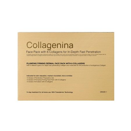 Collagenina – дермо – косметическое средство для домашнего ухода, укрепляет кожу лица, улучшает микрорельеф и разглаживает микроморщины. Помогает придать коже упругость и эластичность, восстанавливая ее тонус, предотвращая расслабление тканей. Маска для лица Collagenina включает в себя 6 типов коллагена с разной молекулярной массой, а также специфические молекулы, которые стимулируют внутреннюю выработку коллагена. Кроме того, в состав входят активные вещества, подготавливающие кожу к более глубокому проникновению коллагена и способствующие его выработке на протяжении дня. Благодаря своим свойствам Collagenina способна значительно увеличивать плотность тканей кожи и толщину эпидермиса и дермы. 14-дневный уход для домашнего использования. С трансдермальной технологией для лучшего проникновения активных веществ. Уровень 1: начальная потеря объема, микроморщины и мимические изменения, явные неровности микрорельефа кожи