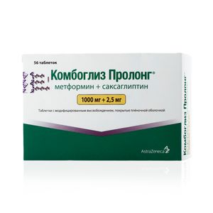 Показания к применениюСахарный диабет 2 типа в сочетании с диетой и физическими упражнениями для улучшения гликемического контроля.Применение при беременности и кормлении грудьюДанные не предоставлены.Противопоказания— повышенная индивидуальная чувствительность к любому компоненту препарата; ;— серьезные реакции повышенной чувствительности (анафилаксия или ангионевротический отек) к ингибиторам ДПП-4; ;— сахарный диабет 1 типа (применение не изучено); ;— применение совместно с инсулином (не изучено); ;— врожденные непереносимость галактозы, лактазная недостаточность и глюкозо-галактозная мальабсорбция; ;— беременность, лактация; ;— возраст до 18 лет (безопасность и эффективность не изучены); ;— нарушения функции почек (сывороточный креатинин ≥1,5мг/дл [мужчины], ≥1,4 мг/дл [женщины] или снижен клиренс креатинина), в том числе обусловленные острой сердечно-сосудистой недостаточностью (шоком), острым инфарктом миокарда и септицемией; ;— острые заболевания, при которых имеется риск развития нарушения функции почек: дегидратация (при рвоте, диарее), лихорадка, тяжелые инфекционные заболевания, состояния гипоксии (шок, сепсис, инфекции почек, бронхо-легочные заболевания); ;— острый или хронический метаболический ацидоз, включая диабетический кетоацидоз, с комой или без комы; ;— клинически выраженные проявления острых и хронических заболеваний, которые могут привести к развитию тканевой гипоксии (дыхательная недостаточность, сердечная недостаточность, острый инфаркт миокарда); ;— серьезные хирургические операции и травмы (когда показано проведение инсулинотерапии); ;— нарушения функции печени; ;— хронический алкоголизм и острое отравление этанолом; ;— лактоацидоз (в т. ч. в анамнезе); ;— период не менее 48 ч до и в течение 48 ч после проведения радиоизотопных или рентгенологических исследований с введением йодсодержащих контрастных средств; ;— соблюдение гипокалорийной диеты; С осторожностью;У лиц в возрасте старше 60 лет, выполняющих тяжелую физическую работу (повышенная опасность развития лактоацидоза) и пациентов с панкреатитом в анамнезе (связь между приемом препарата и повышенным риском развития панкреатита не установлена).Побочное действиеИнфекции верхних дыхательных путей, инфекции мочевыводящих путей, головная боль, боль в животе, рвота, гастроэнтеритСоставДействующее вещество: Метформина гидрохлорид, саксаглиптин;Концентрация действующего вещества (мг): 1002,5Взаимодействие с другими препаратамиДанные не предоставлены.