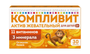 Действие БАД «Компливит® Актив жевательный» обусловлено свойствами входящих в состав компонентов. Комплекс витаминов и минералов, являющихся важными факторами полноценного физического и интеллектуального развития ребенка, укрепления иммунитета, усиления адаптационных возможностей организма.Сбалансирован с учетом рекомендуемых уровней потребления микронутриентов.Витамин А необходим для иммунной защиты организма ребенка, повышает барьерную функцию слизистых оболочек, повышает сопротивляемость организма к вирусным и бактериальным инфекциям. Принимает участие в повышении сопротивляемости организма к инфекциям. Участвует в синтезе зрительных пигментов, необходим для сумеречного и цветового зрения. Необходим для формирования и роста костей, для здорового состояния кожи, зубов, волос. Является антиоксидантом.Витамин Е обладает выраженными антиоксидантными свойствами, способствует укреплению иммунитета и повышению защитных сил организма. Оказывает положительное влияние на функции нервной и мышечной ткани, участвует в процессах кроветворения. При недостатке в организме витамина Е повышаются подверженность инфекционным заболеваниям, риск воспалительных процессов, появляется мышечная слабость.Витамин С играет важную роль в работе иммунной системы, способствуя повышению устойчивости организма к инфекциям, обеспечивает синтез коллагена, участвует в формировании и поддержании структуры и функции хрящей, костей, зубов, участвует в созревании эритроцитов, в регенерации тканей. Витамин С способствует поддержанию в здоровом состоянии кожи, снижает воспалительные реакции. Обладает выраженными антиоксидантными свойствами, нормализует проницаемость капилляров.Витамин В1 способствует нормализации работы нервной и сердечно-сосудистой систем, способствует повышению иммунной защиты организма, предупреждает развитие физической и психической утомляемости.Витамин В2 участвует в белковом, углеводном и жировом обменах, синтезе гемоглобина, поддерживает зрительную функцию. При недостатке витамина В2 характерны появление трещин на губах и в углах рта, конъюнктивит.Витамин В6 необходим для нормального функционирования центральной и периферической нервной системы, улучшает переносимость психоэмоциональных нагрузок, уменьшает раздражительность, повышает умственную работоспособность, облегчает адаптацию организма в условиях стресса.Витамин В12 является важным фактором нормального роста, кроветворения и развития эпителиальных клеток, необходим для функционирования центральной нервной системы ребенка. Повышает устойчивость эритроцитов к гемолизу. Повышает способность тканей к регенерации.Витамин В3 (никотинамид) участвует в процессах тканевого дыхания, жирового и углеводного обмена. Недостаточность витамина В3 в организме характеризуется нарушениями стула, дерматитами и психическими расстройствами.Фолиевая кислота (В9) принимает участие в синтезе аминокислот, нуклеотидов, необходима для процессов кроветворения, улучшает регенерацию поврежденных тканей.Витамин В5 участвует в углеводном и жировом обмене, имеет важное значение для процессов роста, способствует построению, регенерации кожных покровов и слизистых, участвует в передаче нервных импульсов. Проявляться недостаточность витамина В5 может дер