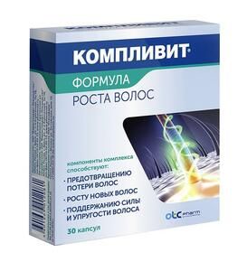 Компливит® Формула роста волос — биологически активная добавка (БАД) к пище — специализированный комплекс витаминов, минералов и биологически активных веществ, действие которых направлено против выпадения волос и способствует росту новых волос.Компоненты комплекса участвуют во всех видах обмена веществ, проявляют антиоксидантные свойства, ускоряют процессы регенерации, способствуют: Предотвращению потери волос Росту новых волос Восстановлению структуры волос Предотвращению сечения волос Поддержанию силы и упругости волоса Укреплению волос Поддержанию нормального состояния и функционирования кожи и волосСодержащийся в комплексе экстракт плодов карликовой пальмы способен блокировать действие фермента 5-альфа-редуктазы и препятствовать превращению тестостерона в дигидротестостерон, который блокирует факторы роста волос, что является частой причиной выпадения волос у женщин и облысения у мужчин. Используется для замедления потери волос, вызванной избытком дигидротестостеронаСодержание в одной капсуле: Витамин С, мг — 35 Витамин Е, мг — 5 Витамин А, мг — 0,25 Витамин В5 (кальция D-пантотенат), мг — 2,5 Витамин В6, мг — 1 Биотин, мкг — 25 Цинк, мг — 6 Марганец, мг — 1 Медь, мг — 0,5 Инозит, мг — 150Пищевая ценность 1 капсулы: белки — 0,1 г, жиры — 0 г, углеводы — 0,1 г.Энергетическая ценность — 2 ккал/3 кДж.Действие БАД «Компливит® Формула роста волос» обусловлено свойствами входящих в состав компонентов (по литературным данным):Витамин С (аскорбиновая кислота) участвует в регулировании окислительно-восстановительных процессов, углеводного обмена, свертываемости крови, регенерации тканей, в метаболизме железа, белков и липидов, а также в иммунных реакциях, повышает устойчивость организма к инфекциям. Нормализует проницаемость капилляров, участвует в синтезе коллагена, благодаря чему поддерживает в здоровом состоянии кровеносные сосуды, кожу.Пантотеновая кислота (В5) участвует в углеводном и жировом обмене, ускоряет процессы регенерации, участвует в передаче нервных импульсов. Недостаток витамина В5 может вызывать дерматит, приводить к нарушению роста волос и преждевременной седине.Витамин В6 (пиридоксин) участвует в обмене веществ; необходим для нормального функционирования центральной и периферической нервной системы, необходим для поддержания оптимального состояния кожи, волос, ногтей. Дефицит витамина В6 может проявляться сухим себорейным дерматитом (в том числе волосистой части головы), тошнотой, потерей аппетита, стоматитом.Витамин А (ретинол) участвует в формировании зрительных пигментов, необходим для сумеречного и цветового зрения, для роста костей, нормальной репродуктивной функции, обеспечивает целостность эпителиальных тканей, защищает кожу от УФ-излучения. Обладает антиоксидантными свойствами (защищает клеточные структуры от повреждения свободными радикалами). Способствует поддержанию нормальной функции кожи, волос и ногтей. Дефицит в рационе может проявляться сухостью кожи и волос, тусклостью и ломкостью волос и ногтей.Витамин Е (α-токоферола ацетат) обладает выраженной антиоксидантной активностью, защищает клетки и ткани организма от повреждающего воздействия активных форм кислорода; предупреждает гемолиз эритроцитов; оказывает положительное влияние на функции половых желез, нервной и мышечной т