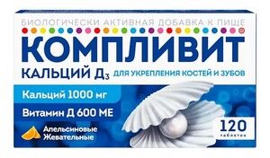 КОМПЛИВИТ КАЛЬЦИЙ Д3 /АПЕЛЬСИН/ — Биологически активная добавка (БАД) к пище, активность которой определяется свойствами входящих в состав компонентов (согласно научным данным):Кальций — минерал, содержащийся в организме человека в большем количестве, чем другие ионы. В среднем, в теле человека содержится около 1 кг кальция, примерно 99% находится в скелете.Кальцию присущ ряд важнейших функций в организме:• Формирование костной ткани, дентина и эмали зубов;• Участие в процессах сократимости мышц, нервной и нервно-мышечной проводимости;• Обеспечение оптимальных условий свертывания крови;• Регуляция проницаемости стенок сосудов;• Поддержание кислотно-щелочного баланса организма;• Активация ряда ферментов и функции некоторых эндокринных желез;Кальций важен для стабильной сердечной деятельности, выработки ряда гормонов, метаболизма адипоцитов (клеток жировой ткани), способствуя, более эффективной потере жировой ткани при похудании/соблюдении диеты, для лучшего контроля веса.Адекватное потребление кальция особенно важно в период роста, беременности и грудного вскармливания.Витамин Д3 (колекальциферол) — относится к группе жирорастворимых витаминов. Способствует всасыванию кальция в кишечнике и поддерживает необходимые уровни кальция и фосфатов в крови для обеспечения минерализации костной ткани. Он также необходим для роста костей и процесса костной перестройки. Достаточный уровень витамина Д предотвращает развитие рахита у детей и нарушений минерализации костной ткани у взрослых. Применение кальция и витамина Д3 препятствует увеличению выработки паратиреоидного гормона (ПТГ), который является стимулятором повышенной костной резорбции (вымывания кальция из костей). Вместе с кальцием витамин Д применяется для снижения риска развития и в составе комплексного лечения остеопороза. Функции витамина Д не ограничены только контролем кальций-фосфорного обмена, он также влияет и на другие физиологические процессы в организме, участвуя в модуляции функций иммунной системы, важен для поддержания репродуктивного здоровья, участвует в поддержании нормальной работы сердечно-сосудистой системы, метаболизме жиров, глюкозы и инсулина, а также регулирует развитие и функционирование структур нервной системы. Низкий уровень витамина Д может предшествовать возрастным когнитивным нарушениям и нейродегенеративным заболеваниям.По данным научных исследований:К наиболее распространенным патологическим состояниям, связанным с дефицитом кальция, могут быть отнесены остеопения (состояние, при котором отмечается уменьшение минеральной плотности костей (МПК) и массы костной ткани) и остеопороз, сопряженные с повышенным риском переломов костей и других травм опорно-двигательного аппарата.В настоящее время есть работы, которые показывают, что прием добавок кальция и витамина Д связан со снижением изменений МПК и переломов. Ряд крупных клинических исследований показали, что дополнительный прием кальция и витамина Д связан со снижением риска переломов и потери костной массы.Также, доказано, что недостаточное поступление кальция, приводит к образованию неполноценных по структуре и свойствам кристаллов гидроксиапатитов в твердых тканях зубов, что снижет резистентность зубов к кариесу, а также к возникновению дефектов э