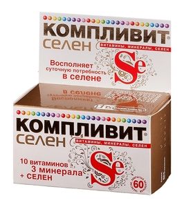 СоставАскорбиновая кислота (витамин С) 50,0 мг, ? — Токоферола ацетат (витамин Е) 10,0 мг, Никотинамид (витамин РР) 7,5 мг, Кальция пантотенат (витамин В 5 ) 5,0 мг, Пиридоксина гидрохлорид (витамин В 6 ) 2,0 мг, Рибофлавин (витамин В 2 ) 2,0 мг, Цинк 2,0 мг, Тиамина гидрохлорид (витамин В 1 ) 1,0 мг, Марганец 1,0 мг, Медь 0,75 мг, Ретинола ацетат (витамин А) 0,5 мг (1453,5 ME), Фолиевая кислота 100 мкг, Селен (в виде натрия селенита) 70 мкг, Цианокобаламин (витамин В 12 ) 3,0 мкг Вспомогательные вещества: Сахар, лактоза (сахар молочный), крахмал, лудипресс, повидон (Е 1201), лимонная кислота (Е 330), тальк (Е 553), титана диоксид (Е 171), гидроксипропилметилцеллюлоза (гипромеллоза) (Е 464), кальция стеарат (Е 470), полиэтиленгликоль (Е 1521), краситель индигокармин (Е 132) — до получения таблетки массой 210 мг