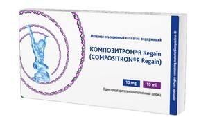 Композитрон® — это медицинское изделие однократного применения, представляющее собой инъекционный материал в предварительно наполненных шприцах в нескольких вариантах исполнения на основе водного раствора гидролизованного коллагена в фосфатном буфере.Не содержит латекса и фталатов.Композитрон® не включает в себя лекарственные средства, фармацевтические субстанции, производные клеток и тканей человека.Не имеет радиационных и электромагнитных свойств.Изделие выпускается в стерильных шприцах из сложного полиэфира в следующих вариантах исполнения:Вариант — Концентрация коллагена — Объем раствораКомпозитрон® 5 — 5 мг/мл (0,5%) — 0,5 мл, 1 мл, 2 млКомпозитрон® 2 — 2 мг/мл (0,2%) — 0,5 мл, 1 мл, 2 млКомпозитрон® Regain — 1 мг/мл (0,1%) — 10 млКаждый шприц упакован в одинарную или двойную герметичную блистерную упаковку из полиэфирно-алюминиевого ламината, которая помещается вместе с инструкцией по применению в картонную коробку. Изделие стерилизовано гамма-излучением при дозе 25 кГр.НазначениеВосстановление и укрепление коллагена внеклеточного матрикса хрящевой и других видов соединительной ткани, а также протезирование коллагеном синовиальной жидкости при дегенеративно-дистрофических и посттравматических заболеваниях/поражениях соединительной ткани, мышц и суставов, при токсических воздействиях, связанных с профессиональной деятельностью, при процессах, связанных с естественным старением, повышенными нагрузками, постуральными нарушениями или деформациями суставов, а также для промывания полостей синовиальных суставов после открытых и артроскопических вмешательств.НазначениеВосстановление и укрепление коллагена внеклеточного матрикса хрящевой и других видов соединительной ткани, а также протезирование коллагеном синовиальной жидкости при дегенеративно-дистрофических и посттравматических заболеваниях/поражениях соединительной ткани, мышц и суставов, при токсических воздействиях, связанных с профессиональной деятельностью, при процессах, связанных с естественным старением, повышенными нагрузками, постуральными нарушениями или деформациями суставов, а также для промывания полостей синовиальных суставов после открытых и артроскопических вмешательств.Целевые пользователи и область примененияНазначать и применять Композитрон® могут только медицинские специалисты.Область применения: ортопедия, ревматология, травматология, неврология, косметическая медицина.Свойства и механизм действияКомпозитрон® является медицинским изделием для укрепления и восполнения микроструктур внеклеточного матрикса соединительной ткани и протезирования коллагеном синовиальной жидкости. Он может быть рекомендован для улучшения подвижности суставов, поддержания соединительнотканных структур мышц, сухожилий, связок и менисков при дегенеративных процессах, вызванных старением, травмами, повышенными нагрузками и постуральными нарушениями. Он также может применяться при хирургических вмешательствах на суставах с целью ускорения функционального восстановления и улучшения состояния пациентов в послеоперационном периоде, а также при противодействии физиологическому старению и / или дегенерации соединительной и хрящевой тканей.Гидролизованный коллаген позволяет восполнить и укреплять коллагеновый матрикс тканей, по