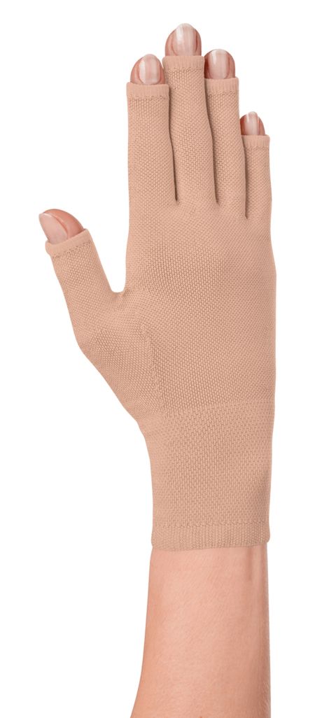 Компрессионная перчатка круговой вязки для эффективной профилактики развития лимфатического отека кисти после перенесенной мастэктомии. Компрессионная перчатка закрывает кисть и пальцы.