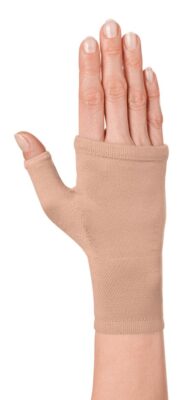 Компрессионная перчатка с открытыми пальцами круговой вязки для эффективной профилактики развития лимфатического отека тыла кисти после перенесенной мастэктомии. Компрессионная перчатка закрывает запястье и кисть.