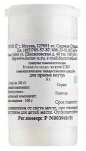 Гранулы гомеопатические однородные, правильной шаровидной формы, белого или белого с серым или кремовым оттенком цвета, без запаха.Conium maculatum /Conium — болиголов пятнистый, относится к семейству зонтичные.Препарат готовят из настойки свежего растения с цветами.