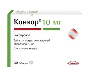 Показания к применению- артериальная гипертензия;- ИБС: стабильная стенокардия;- хроническая сердечная недостаточность.Применение при беременности и кормлении грудьюПрименение препарата Конкор при беременности возможно только в том случае, когда предполагаемая польза для матери превосходит потенциальный риск для плода.Бета-адреноблокаторы снижают кровоток в плаценте и могут повлиять на развитие плода. Следует тщательно контролировать кровоток в плаценте и матке, а также следить за ростом и развитием будущего ребенка, и в случае нежелательных проявлений в отношении беременности или плода, принимать альтернативные терапевтические меры. Следует тщательно обследовать новорожденного после родов. В первые 3 дня жизни могут возникать симптомы брадикардии и гипогликемии.Данных о выделении бисопролола с грудным молоком нет. Прием препарата Конкор не рекомендуется женщинам в период лактации. При необходимости применения препарата в период лактации грудное вскармливание следует прекратить.Противопоказания- острая сердечная недостаточность;- хроническая сердечная недостаточность в стадии декомпенсации, требующая проведения терапии препаратами с положительным инотропным действием;- кардиогенный шок;- AV-блокада II и III степени, без электрокардиостимулятора;- СССУ;- синоатриальная блокада;- выраженная брадикардия (ЧССменьше 60 уд./мин);- выраженное снижение АД (систолическое АД меньше 100 мм рт.ст.);- тяжелые формы бронхиальной астмы и ХОБЛ в анамнезе;- выраженные нарушения периферического артериального кровообращения, болезнь Рейно;- феохромоцитома (без одновременного применения альфа-адреноблокаторов);- метаболический ацидоз;- возраст до 18 лет (недостаточно данных по эффективности и безопасности);- повышенная чувствительность к компонентам препарата.С осторожностью применяют препарат при стенокардии Принцметала, гипертиреозе, сахарном диабете 1 типа и сахарном диабете со значительными колебаниями концентрации глюкозы в крови, AV-блокаде I степени, выраженной почечной недостаточности (КК меньше 20 мл/мин), выраженных нарушениях функции печени, псориазе, рестриктивной кардиомиопатии, врожденных пороках сердца или пороке клапана сердца с выраженными гемодинамическими нарушениями, хронической сердечной недостаточности с инфарктом миокарда в течение последних 3 месяцев, во время проведения десенсибилизирующей терапии, у пациентов, находящихся на строгой диете.СоставБисопролола фумарат 10 мгвспомогательные вещества: кальция гидрофосфат, безводный — 127.5 мг, крахмал кукурузный, мелкий порошок — 14 мг, кремния диоксид коллоидный, безводный — 1.5 мг, целлюлоза микрокристаллическая — 10 мг, кросповидон — 5.5 мг, магния стеарат — 1.5 мг.состав пленочной оболочки: гипромеллоза 2910/15 — 2.2 мг, макрогол 400 — 0.53 мг, диметикон 100 — 0.22 мг, краситель железа оксид желтый (e172) — 0.12 мг, краситель железа оксид красный (e172) — 0.002 мг, титана диоксид (e171) — 0.85 мг.