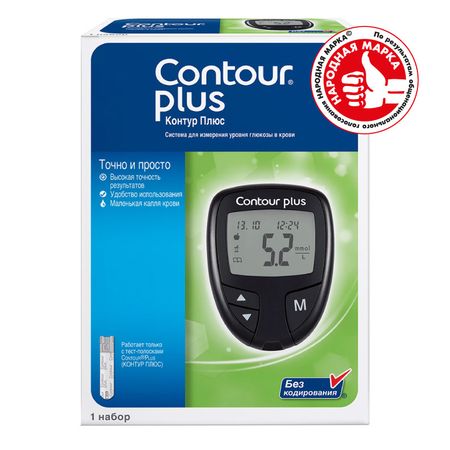 Контур Плюс (Contour Plus) – глюкометр последнего поколения, который обеспечивает точность, сравнимую с лабораторной: Точность прибора превосходит требования нового международного стандарта ISO 15197:2013; Прибор обладает технологией нанесения образца крови «Второй шанс». Данная технология дает возможность дополнительно нанести кровь на ту же тест-полоску в случае, когда первого образца крови было недостаточно — не нужно тратить новую тест-полоску. Технология «Второй шанс» экономит время и деньги Прибор имеет большой экран, а также позволяет настраивать звуковые напоминания об измерении после еды, что помогает в рабочей суматохе вовремя измерить сахар крови Требуется маленькая капля крови всего 0,6 мкл – ее будет достаточно для получения точного результата Прибор проводит измерение всего за 5 секунд, что дает возможность быстро получить результат, что особенно важно при гипогликемии. В приборе используется технология «Без кодирования». Данная технология позволяет прибору каждый раз, когда вставляется тест-полоска, кодироваться автоматически, тем самым устраняется необходимость ручного ввода кода — возможного источника ошибок. Не нужно тратить время на ввод кода или кодового чипа/полоски Технические характеристики: Обеспечивающие точность, сравнимую с лабораторной: В приборе используется Мультиимпульсная технология, которая сканирует каплю крови несколько раз и выдает более точный результат Прибор обеспечивает надежность в широких климатических условиях: рабочий диапазон температур 5°C — 45°, влажность 10 – 93% отн. влажности, высота над уровнем моря – до 6300 м В тест-полоске используется современный фермент, который практически не имеет взаимодействия с лекарствами, что обеспечивает точные измерения при приеме, например, парацетамола, аскорбиновой кислоты/витамина С Глюкометр выполняет автоматическую коррекцию результатов измерений при гематокрите от 0 до 70% — это позволяет получать высокую точность при широком диапазоне гематокрита, который может быть понижен или повышен в результате различных заболеваний Принцип измерения — элетрохимический Обеспечивающие удобство использования: В приборе используется технология «Без кодирования». Данная технология позволяют прибору каждый раз, когда вставляется тест-полоска, кодироваться автоматически, тем самым устраняется необходимость ручного ввода кода — возможного источника ошибок. Не нужно тратить время на ввод кода или кодового чипа/полоски; Не требует кодирования — код вручную вводить не нужно Прибор обладает технологией нанесения образца крови «Второй шанс», которая позволяет дополнительно нанести кровь на ту же тест-полоску в случае, когда первого образца крови было недостаточно — не нужно тратить новую тест-полоску. Технология «Второй шанс» экономит время и деньги. Прибор имеет 2-х режима работы – основной (L1) и расширенный (L2) — возможности прибора при использовании Основного режима (L1): краткая информация о повышенных и пониженных значениях за 7 дней. (HI-LO), автоматический расчет среднего показателя за 14 дней, память, вмещающая результаты 480 последних измерений. Возможности прибора при использовании Расширенного режима (L2): Настраиваемые напоминания о проведении тестирования через 2.5, 2, 1.5, 1 часа после еды, автоматический расчет среднего показателя за 7, 14, 30